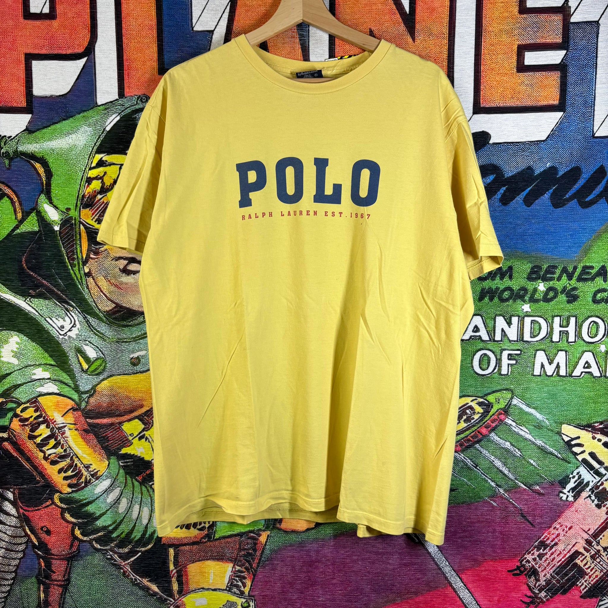 Embrace vintage style with this bold Polo by Ralph Lauren t-shirt, featuring a vibrant sunny yellow color and the classic "POLO EST. 1967" graphic printed in a deep blue across the chest. Perfect for adding a pop of color to any casual fit, this comfortable tee is an essential wardrobe staple from a timeless American fashion house.