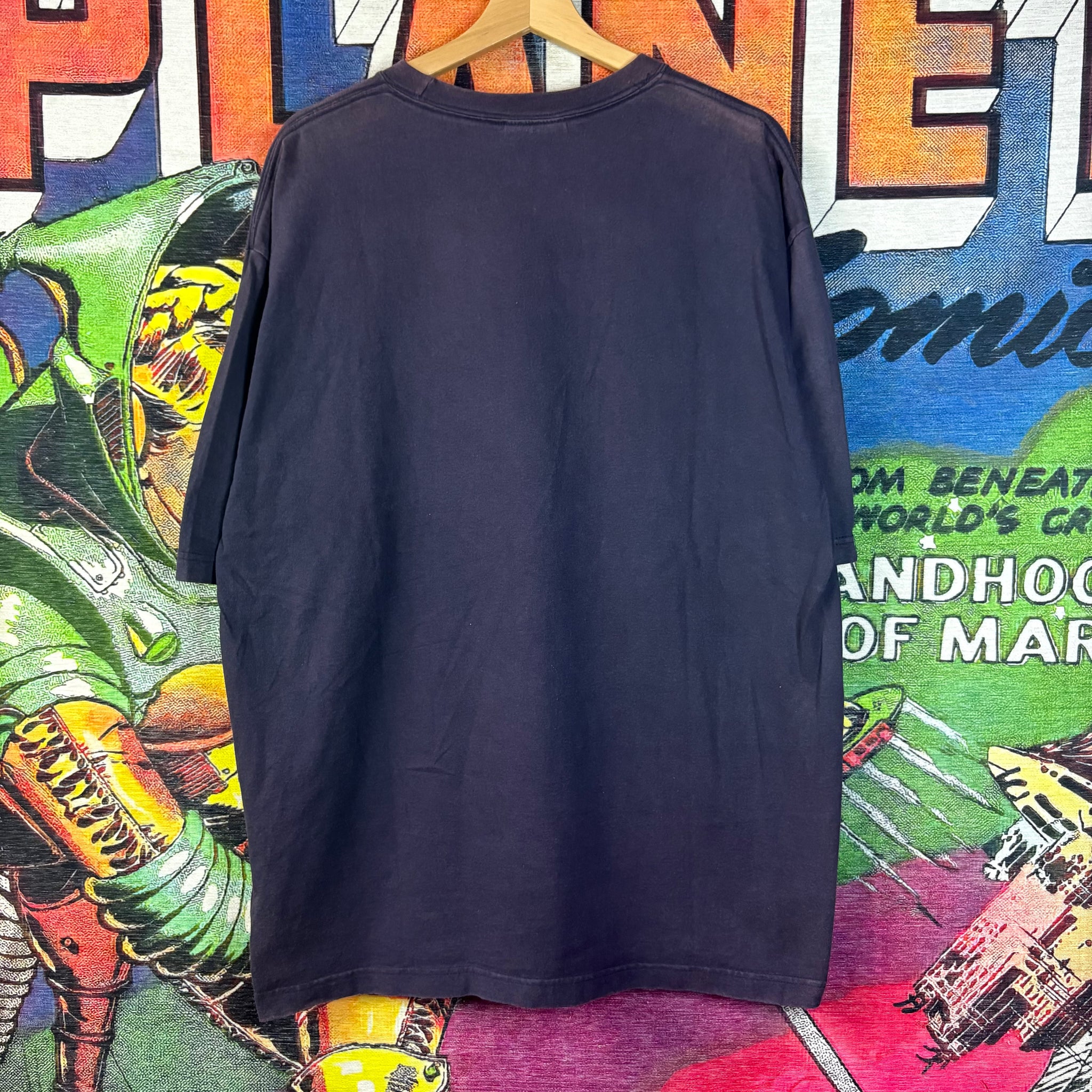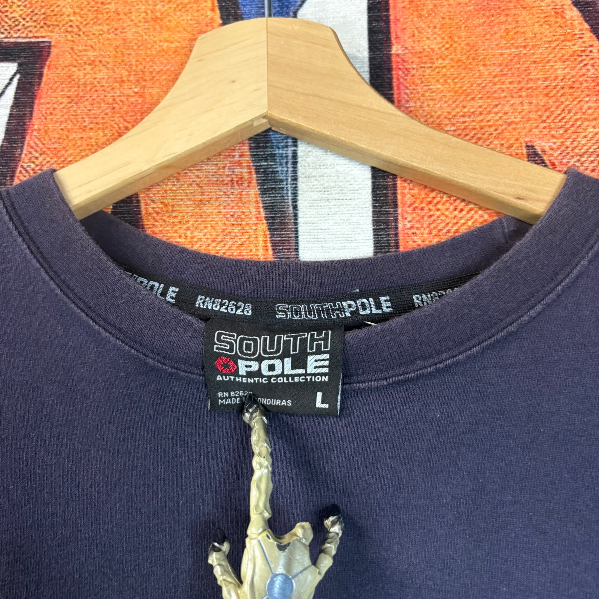 This vintage Southpole "Authentic Collection" graphic tee features a bold, layered text design that evokes a classic early 2000s streetwear aesthetic. The deep navy blue color and oversized fit, combined with the distressed-look patches spelling out "SOUTHPOLE," make this a nostalgic and eye-catching retro statement piece.