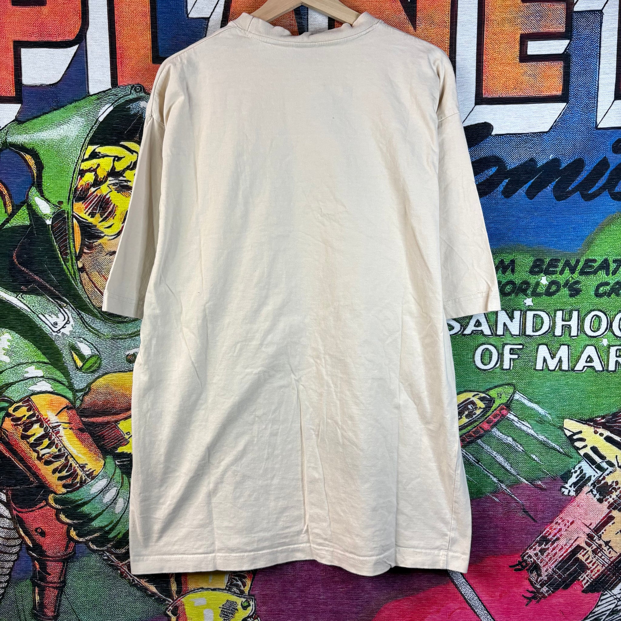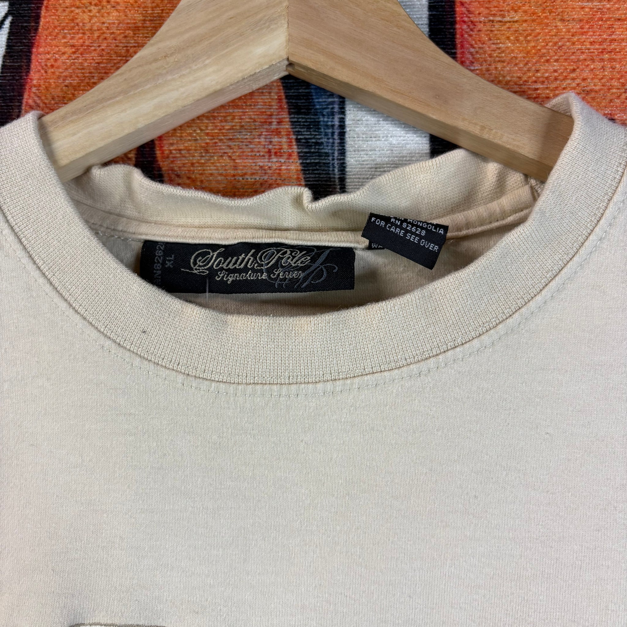 Y2K Southpole Signature Series t-shirt in beige, featuring bold, era-defining graphics that capture the early 2000s streetwear vibe. A soft, worn-in feel adds to its nostalgic charm, making it a standout piece for collectors and fashion enthusiasts alike.