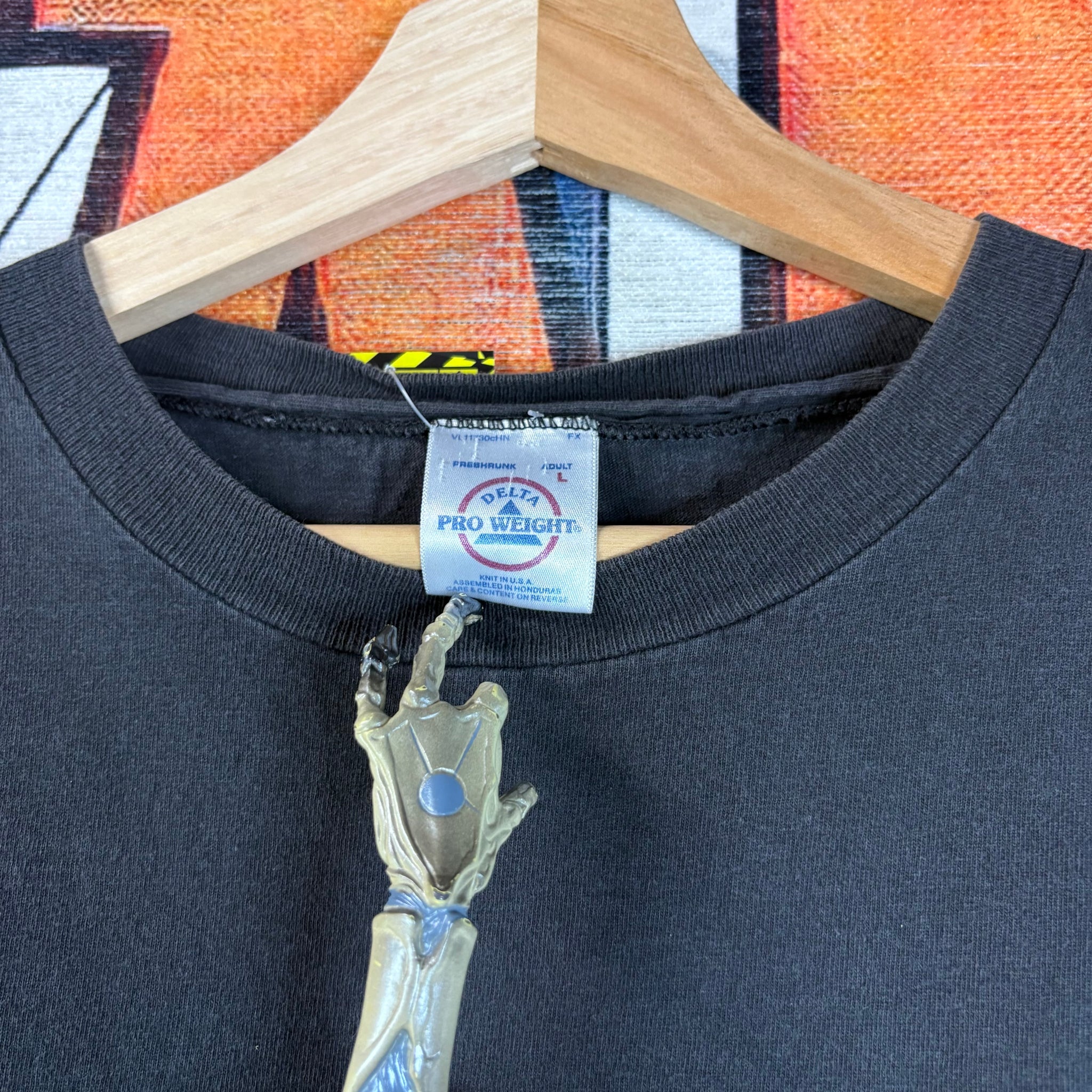This eye-catching vintage tee features a striking, stylized graphic of The Simpsons family in a black-and-white, serious, almost mobster-like pose. Made with a Delta Pro Weight tag, this size large shirt is a unique piece of apparel that merges iconic pop culture with a bold, contrasting aesthetic, making it a must-have for any collector or fan.