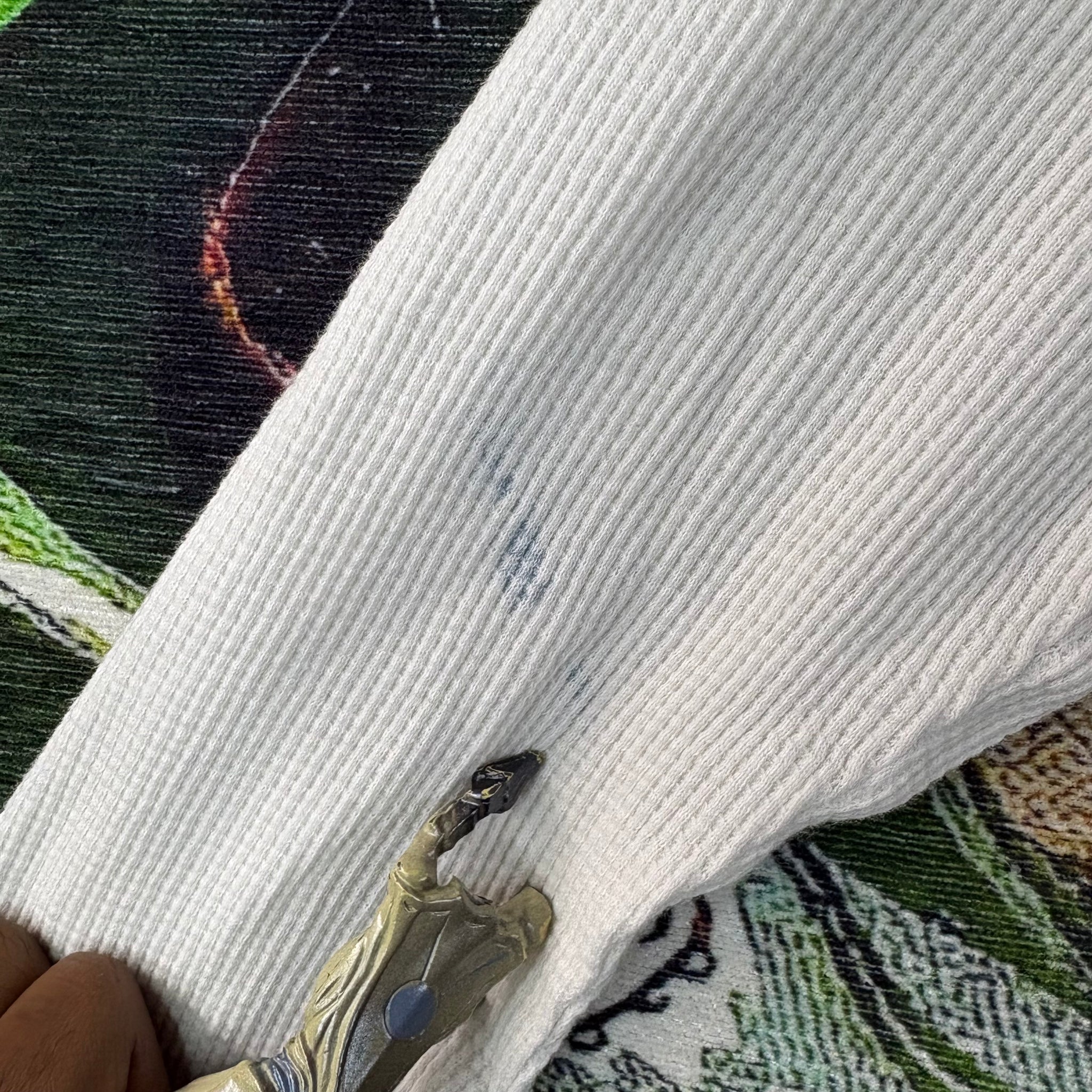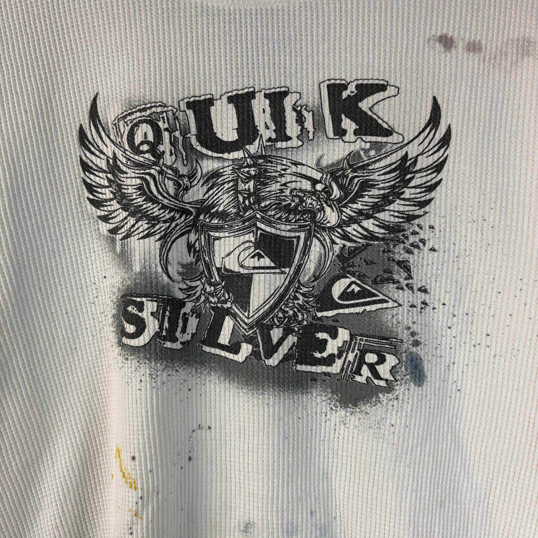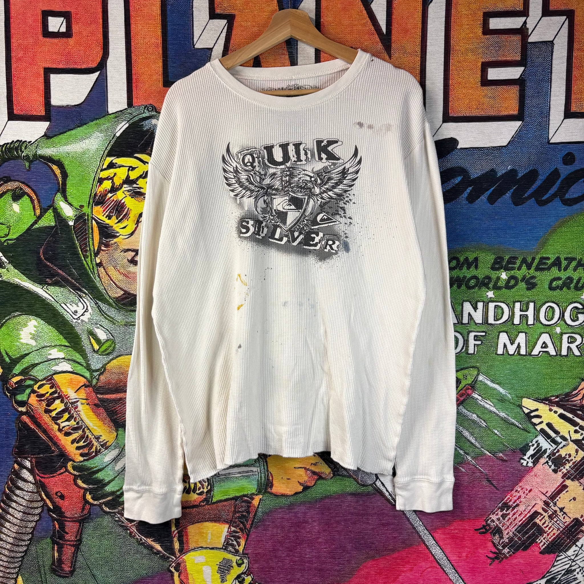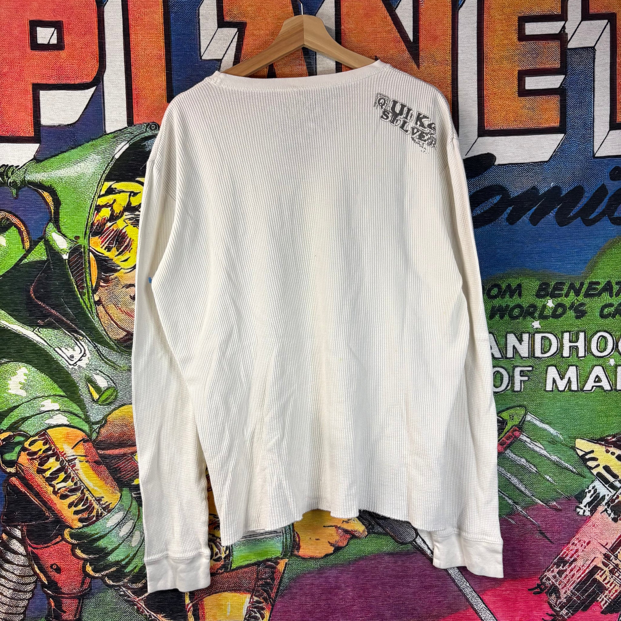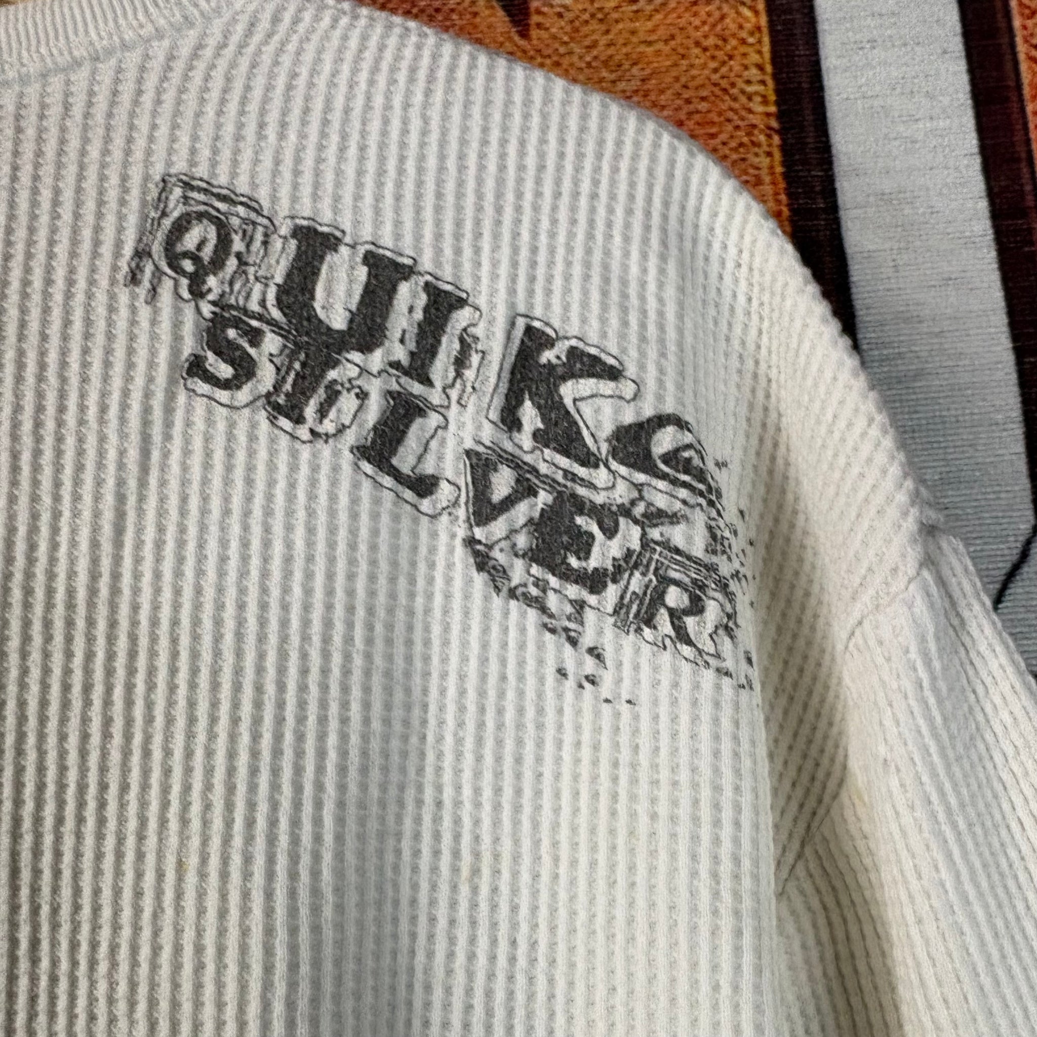 Y2K-era Quiksilver thermal long sleeve shirt in a clean white colorway featuring a graphic print. Classic early-2000s surf/skate influence with a relaxed XL fit and textured thermal construction that adds depth to the piece. Easy to wear on its own or layered, this long sleeve captures Quiksilver’s laid-back Y2K aesthetic while still making a visual statement.