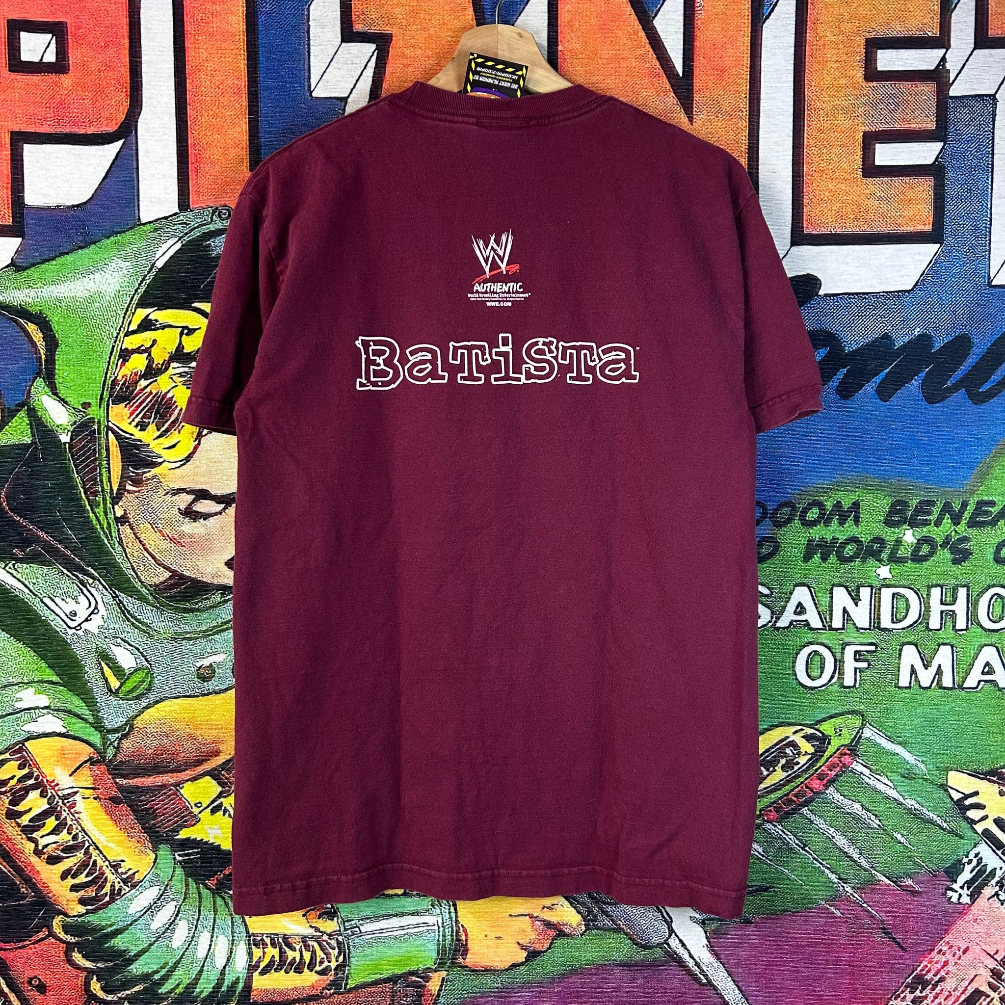 Y2K WWE Batista “R U TALKING 2 ME” tee featuring bold vintage wrestling graphics inspired by WWE legend Batista and classic early-2000s fan culture. Made from soft, comfortable fabric with a relaxed fit, this shirt blends nostalgic wrestling style with everyday wearability — perfect for casual outfits or layered looks.