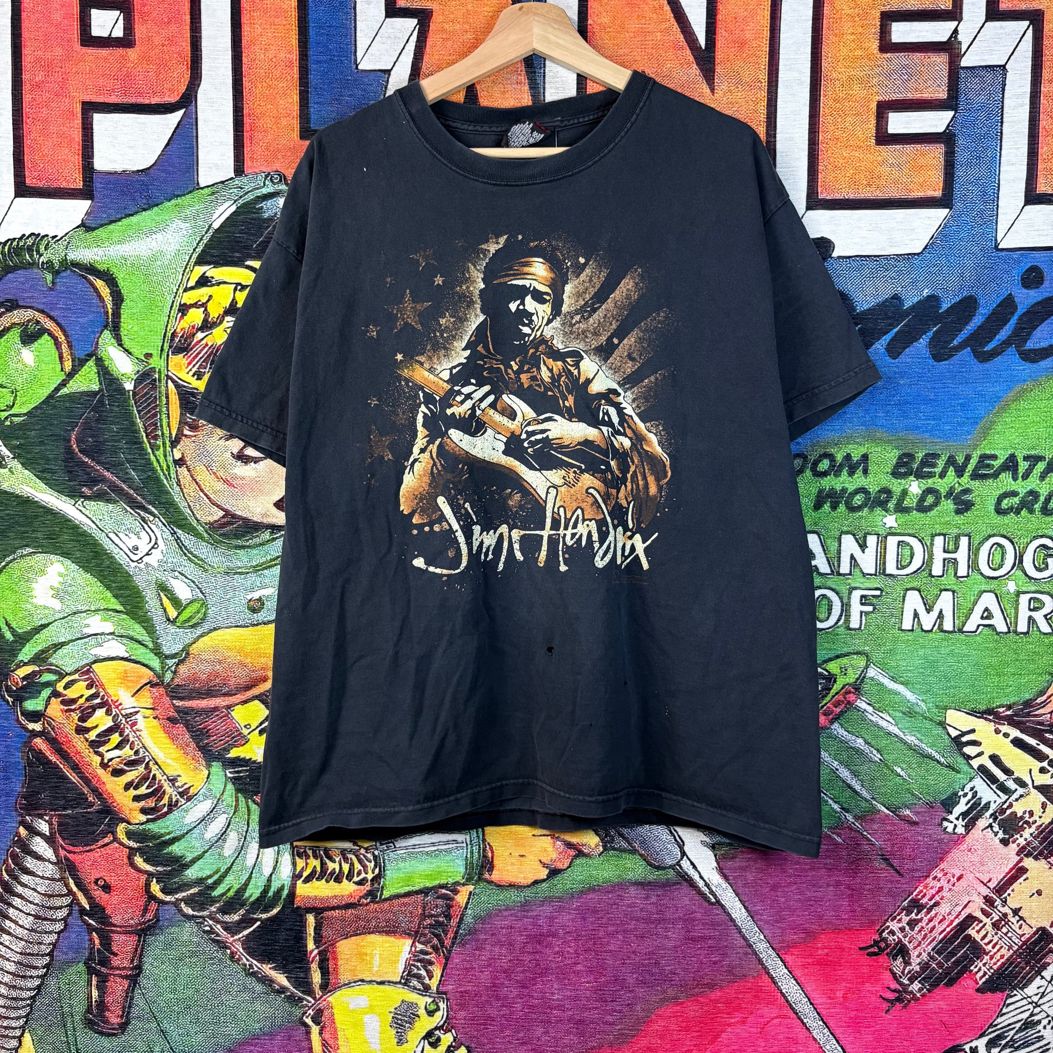 Celebrate one of music’s greatest icons with this 2007 Jimi Hendrix Y2K-era tee, featuring vivid artwork that captures the electric, psychedelic energy Hendrix is known for. Printed on a classic mid-2000s cotton body, this piece delivers that authentic vintage-inspired look — slightly cropped in length with a roomy XL chest for a true early-2000s fit.