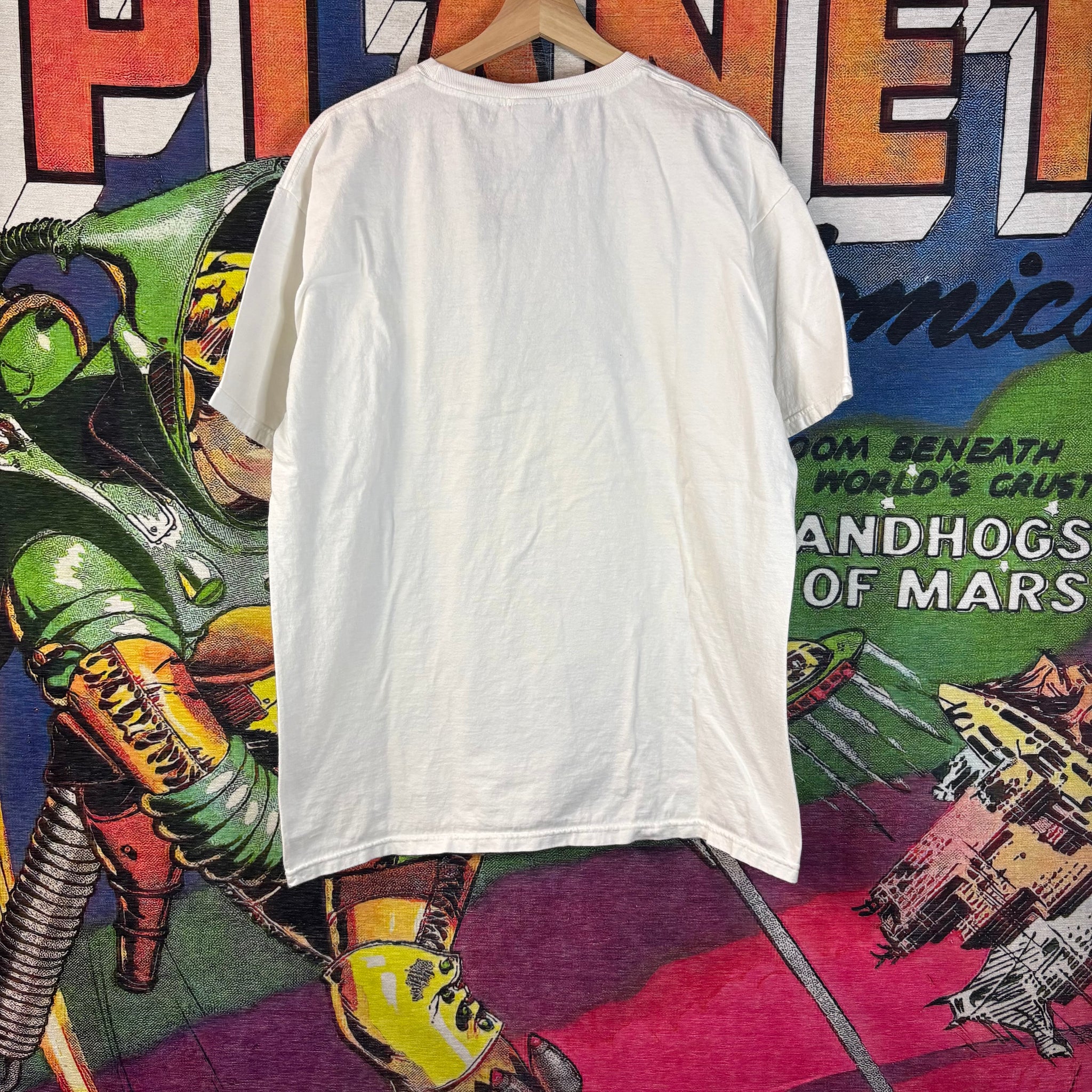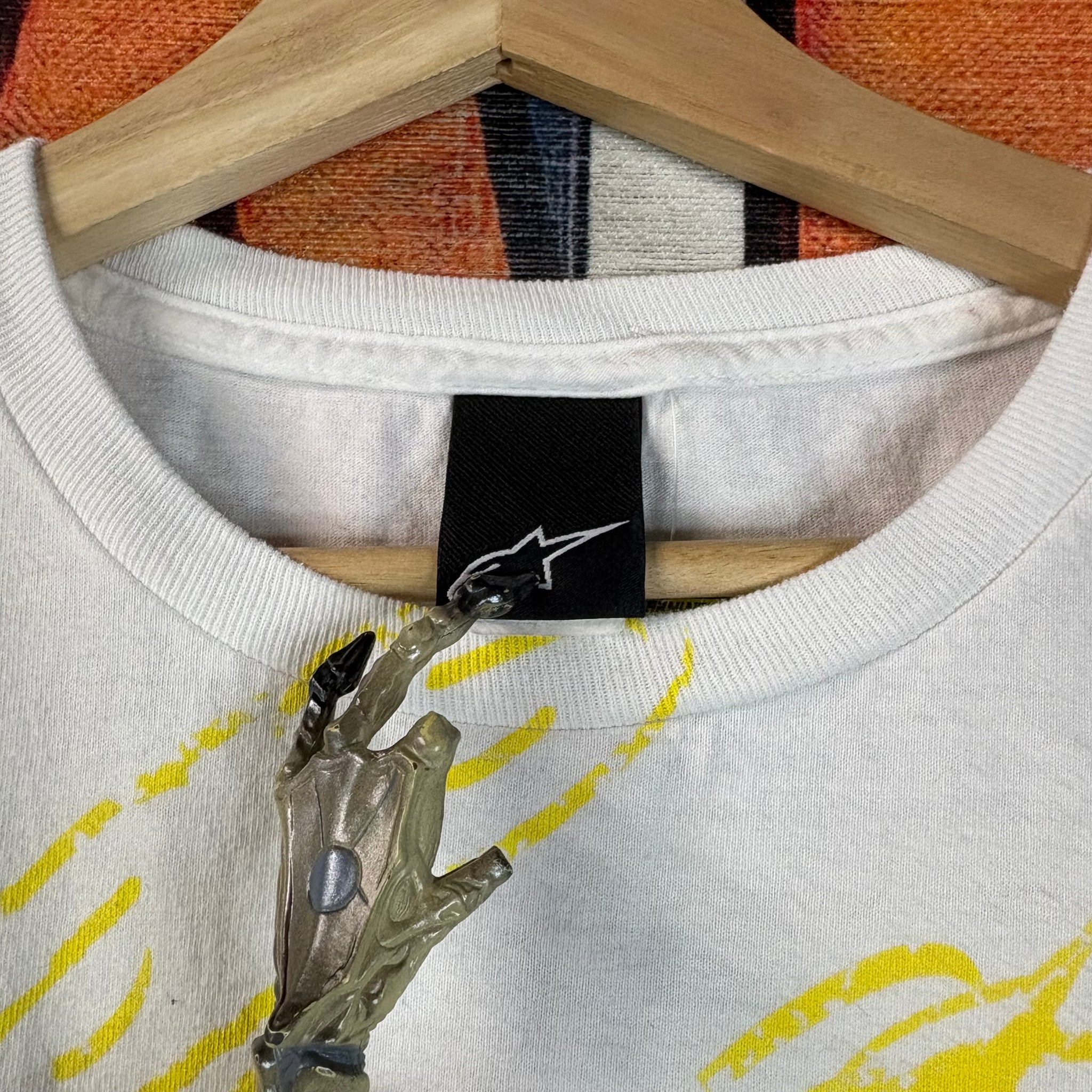 This is a white graphic T-shirt from Alpinestars, the prominent brand known for its motorsport and action sports apparel. The shirt features a vibrant, dynamic graphic consistent with racing and extreme sports culture.