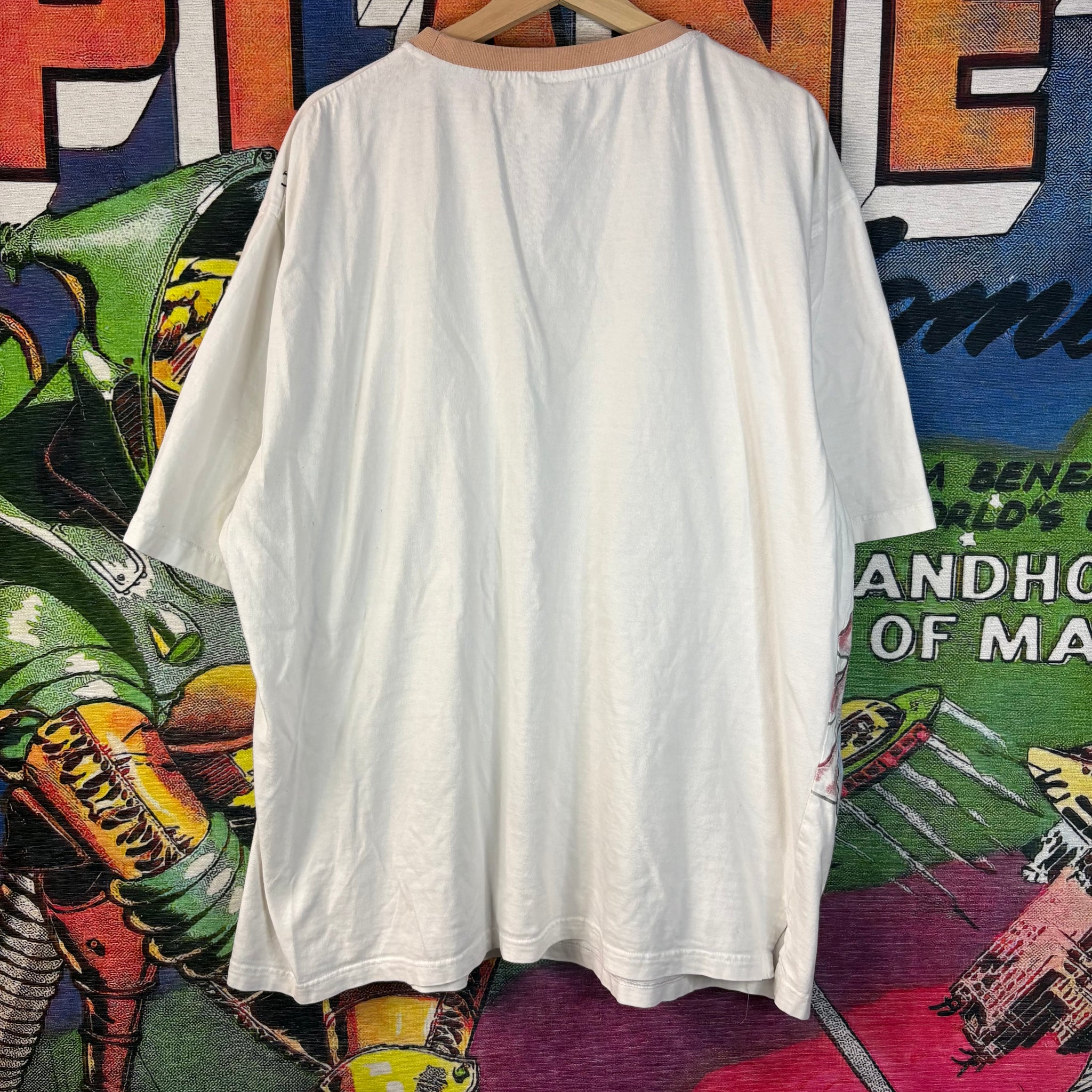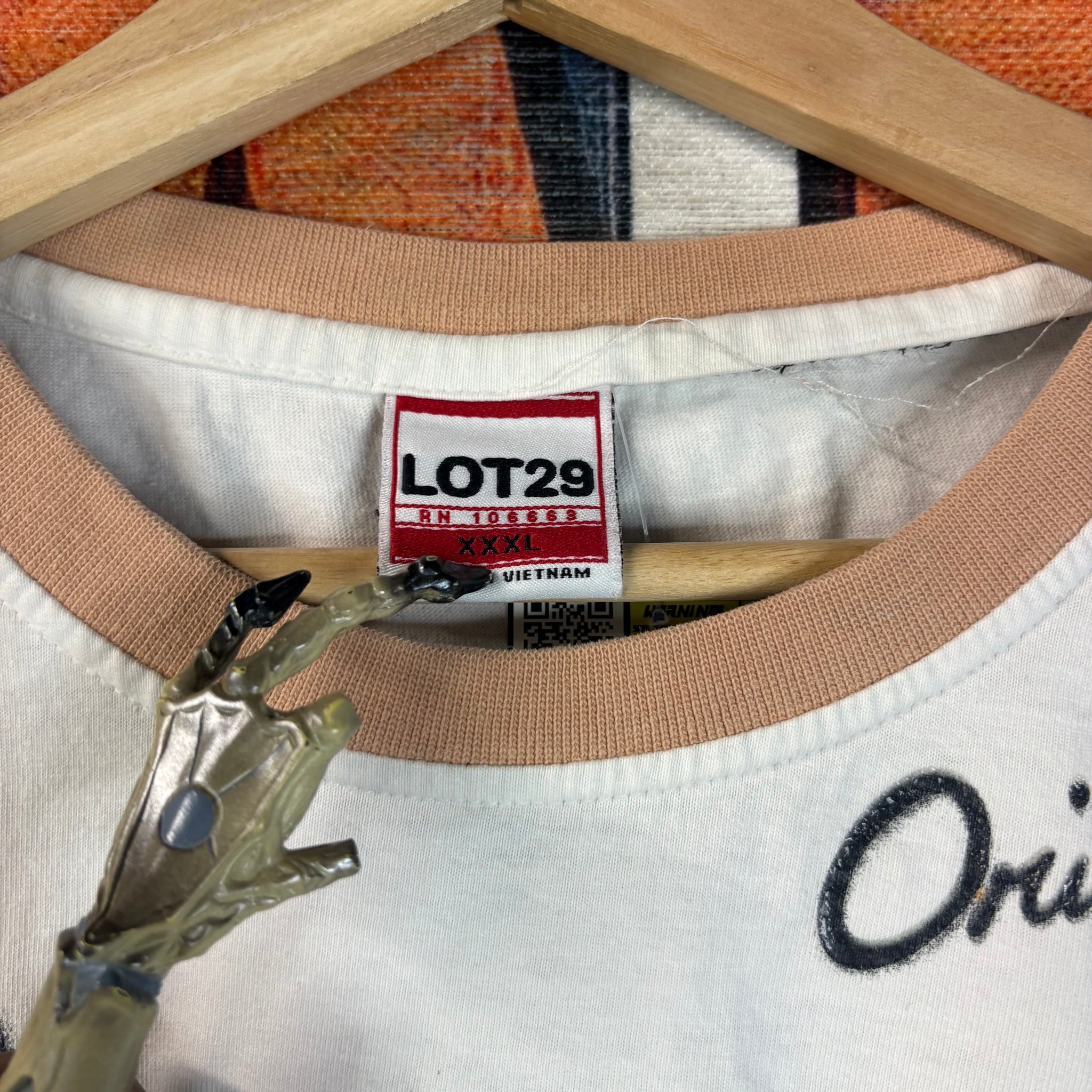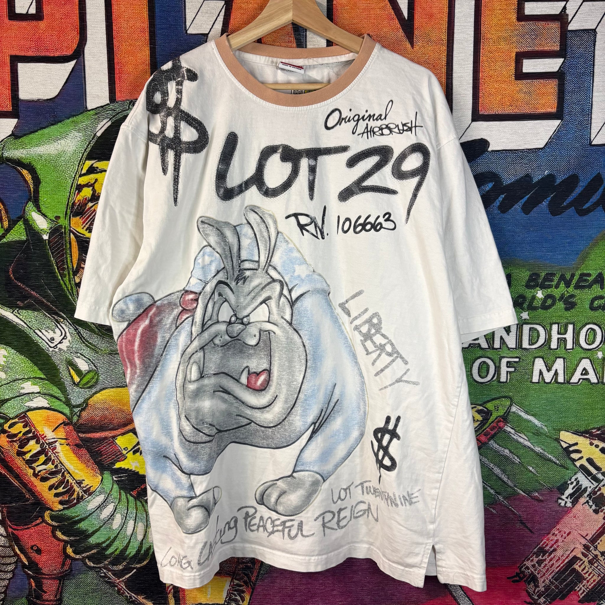 This is a visually dynamic and authentic vintage LOT29 T-shirt, a brand known for its early 2000s urban streetwear aesthetic. The shirt is an XXXL white body with a stylish tan/brown ringer neck trim, offering a comfortable, oversized fit. The main feature is a bold, graffiti-style airbrushed graphic of a growling bulldog, accented by "$” symbols, the brand name “LOT 29,” and the phrase "LIBERTY," making it a striking piece of Y2K-era licensed streetwear.
