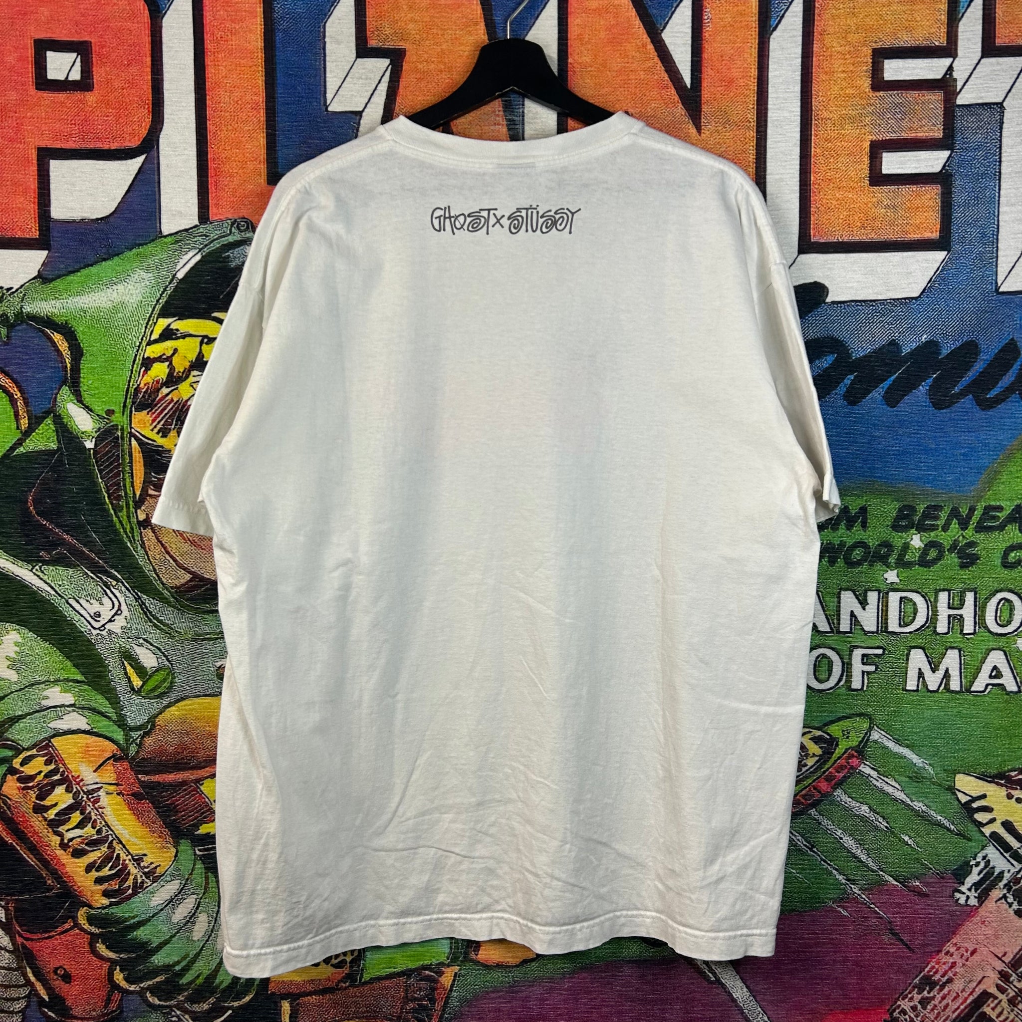 2009 Stüssy x Ghost collab tee featuring the artist’s signature street-inspired graphic style. A rare piece from the late 2000s era of Stüssy.