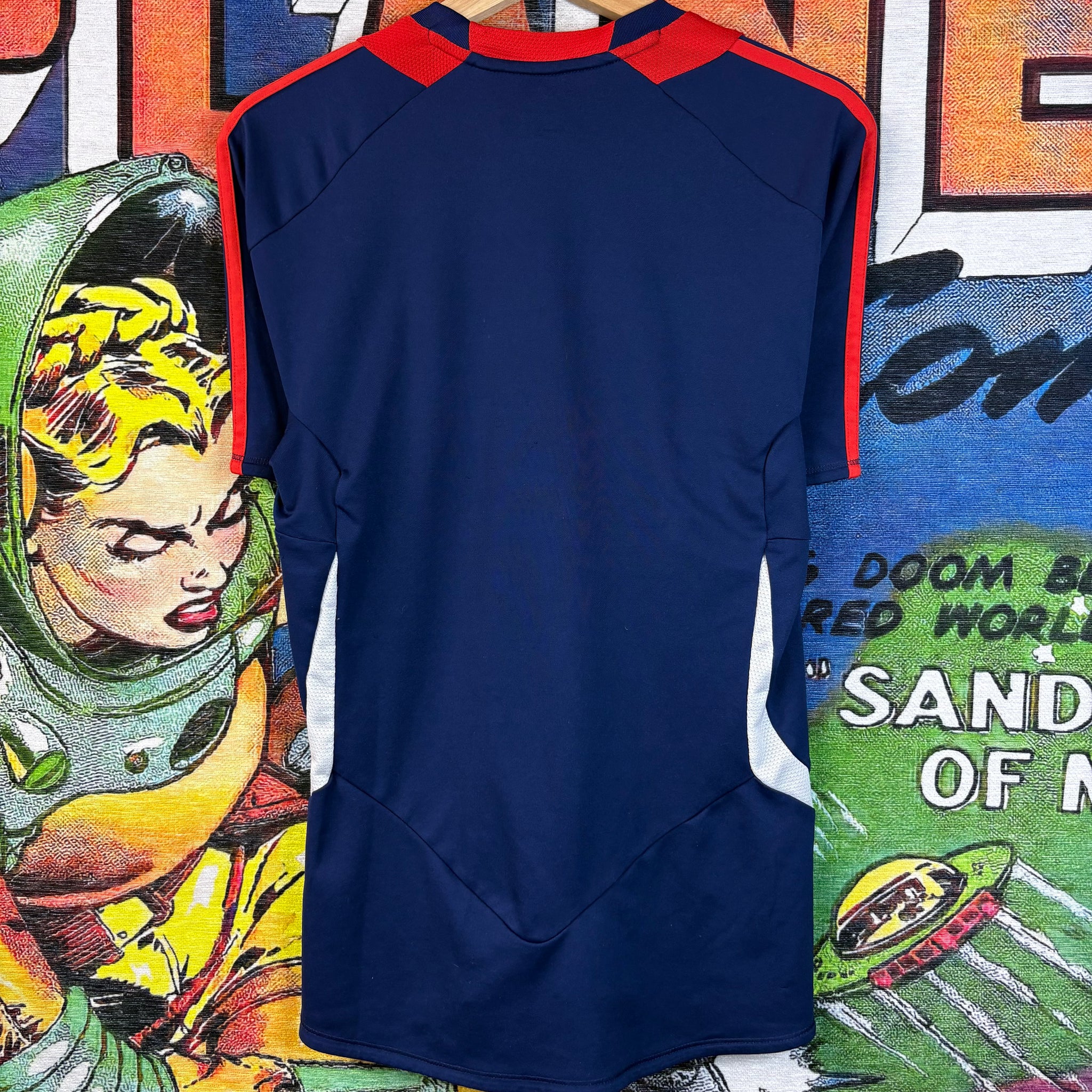 This eye-catching navy blue Adidas shirt is a piece of sporting history, featuring bold red shoulder stripes and the impressive Russian national team crest with the double-headed eagle. The white FORMOTION paneling near the hem adds a dynamic, modern touch to this classic football top.