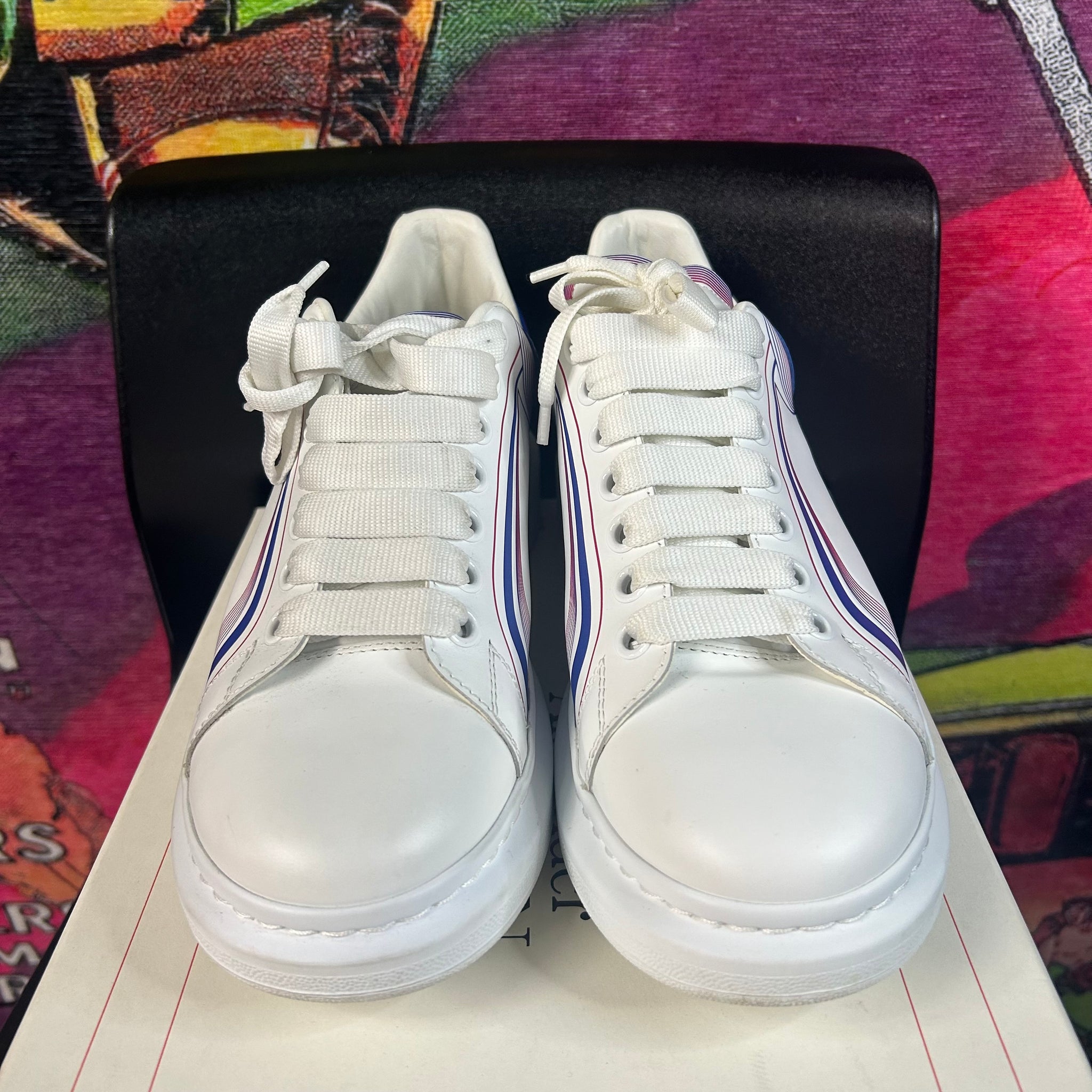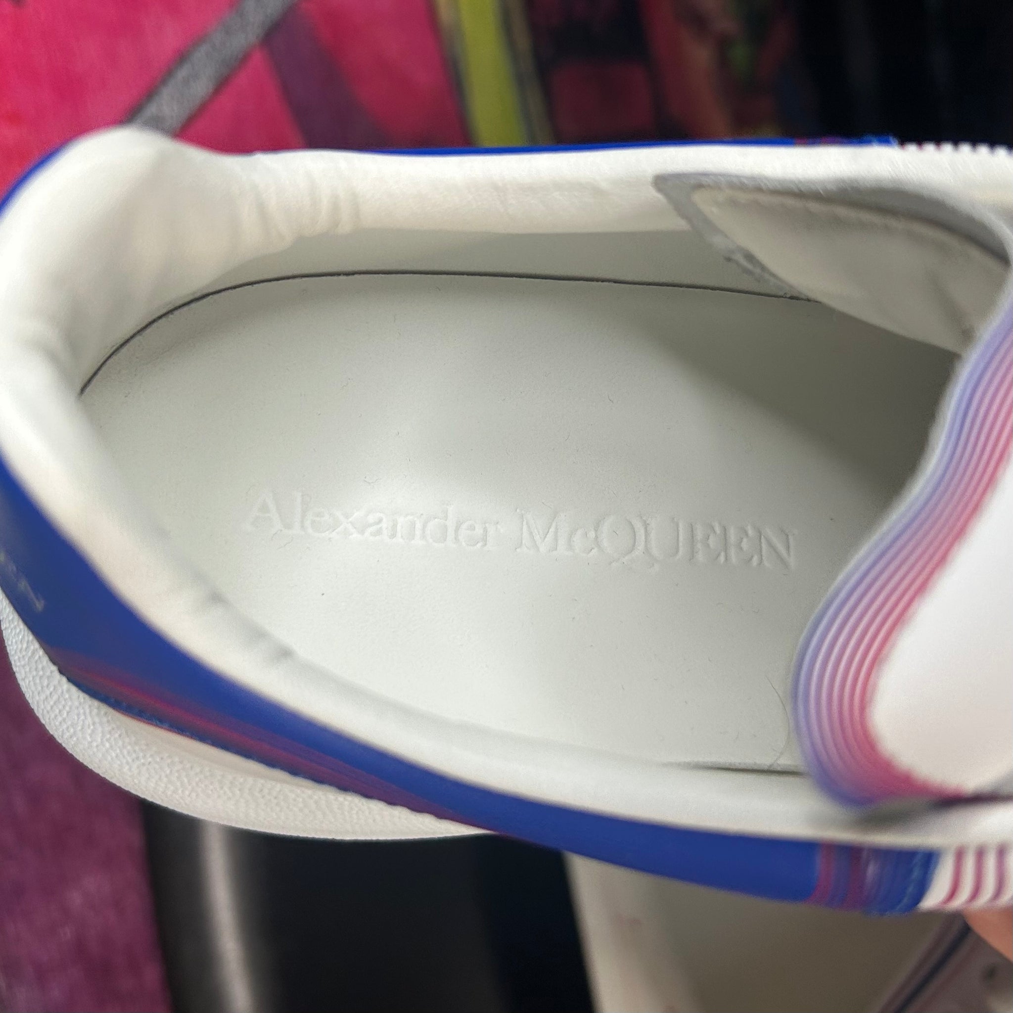 Sleek and instantly recognizable, these Alexander McQueen Oversized Sneakers feature the brand’s iconic exaggerated sole paired with a clean white leather upper and striking galactic blue heel tab. A perfect balance of luxury and streetwear, they’re crafted for comfort and durability while making a bold statement. A staple silhouette that elevates any casual or designer-forward fit.