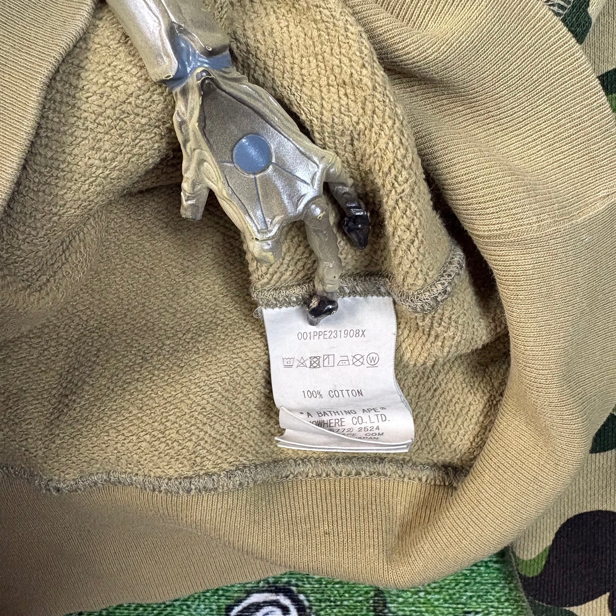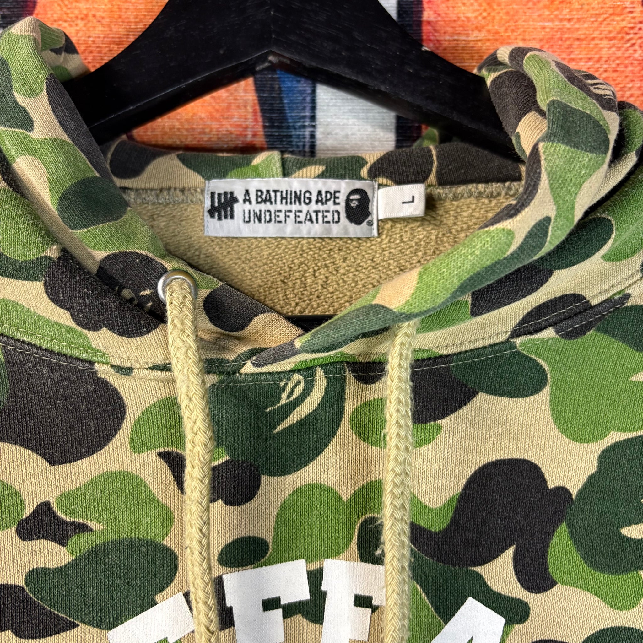 This is a highly sought-after A Bathing Ape (BAPE) pullover hoodie, featuring the iconic green 1st Camo print in a collaboration with the legendary streetwear brand UNDEFEATED. The hoodie prominently displays a large, white graphic on the chest that features the UNDEFEATED logo surrounding the classic BAPE Head ape graphic and "APE" underneath, combining the signature aesthetics of both powerhouse brands. This piece is a must-have for collectors of premium, exclusive streetwear collaborations.
