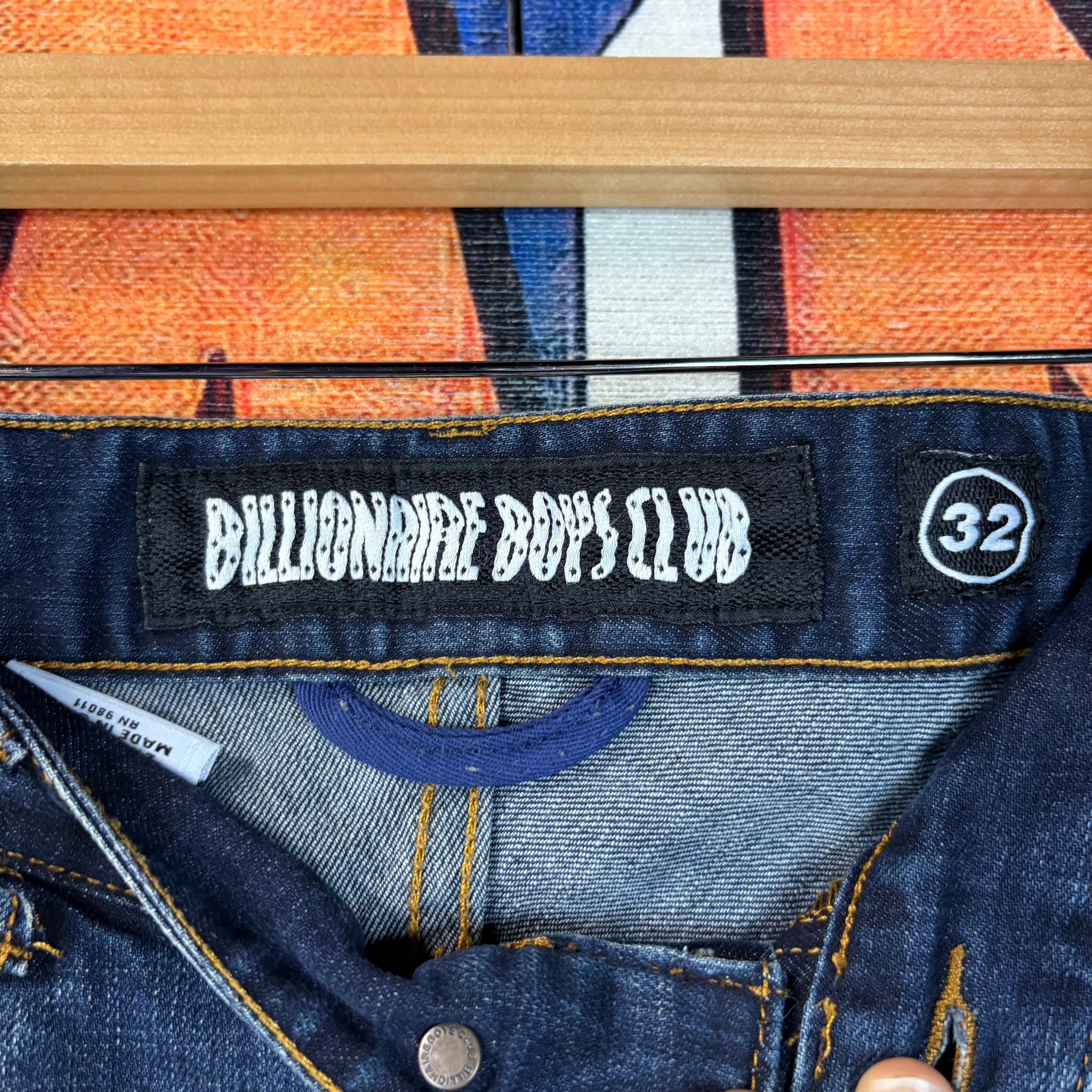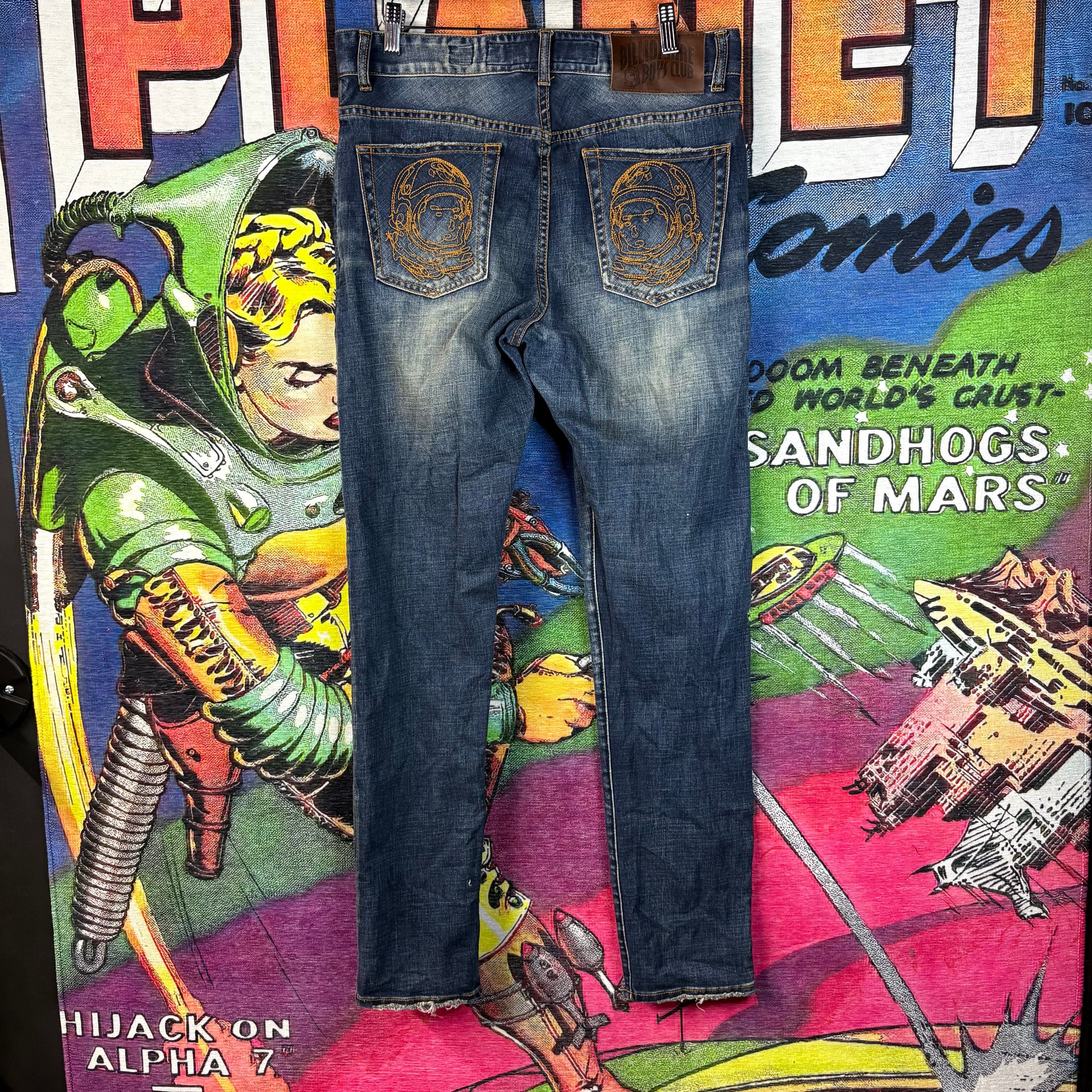 These are a striking pair of blue denim jeans from Billionaire Boys Club (BBC), the brand founded by Pharrell Williams. The front of the jeans has the large BILLIONAIRE BOYS CLUB logo embroidered in a metallic gold or yellow thread The back pockets feature complex, intricate gold or yellow embroidery of the BBC Astronaut Helmet logo. The back waistband has a brown leather patch debossed with the BILLIONAIRE BOYS CLUB logo .