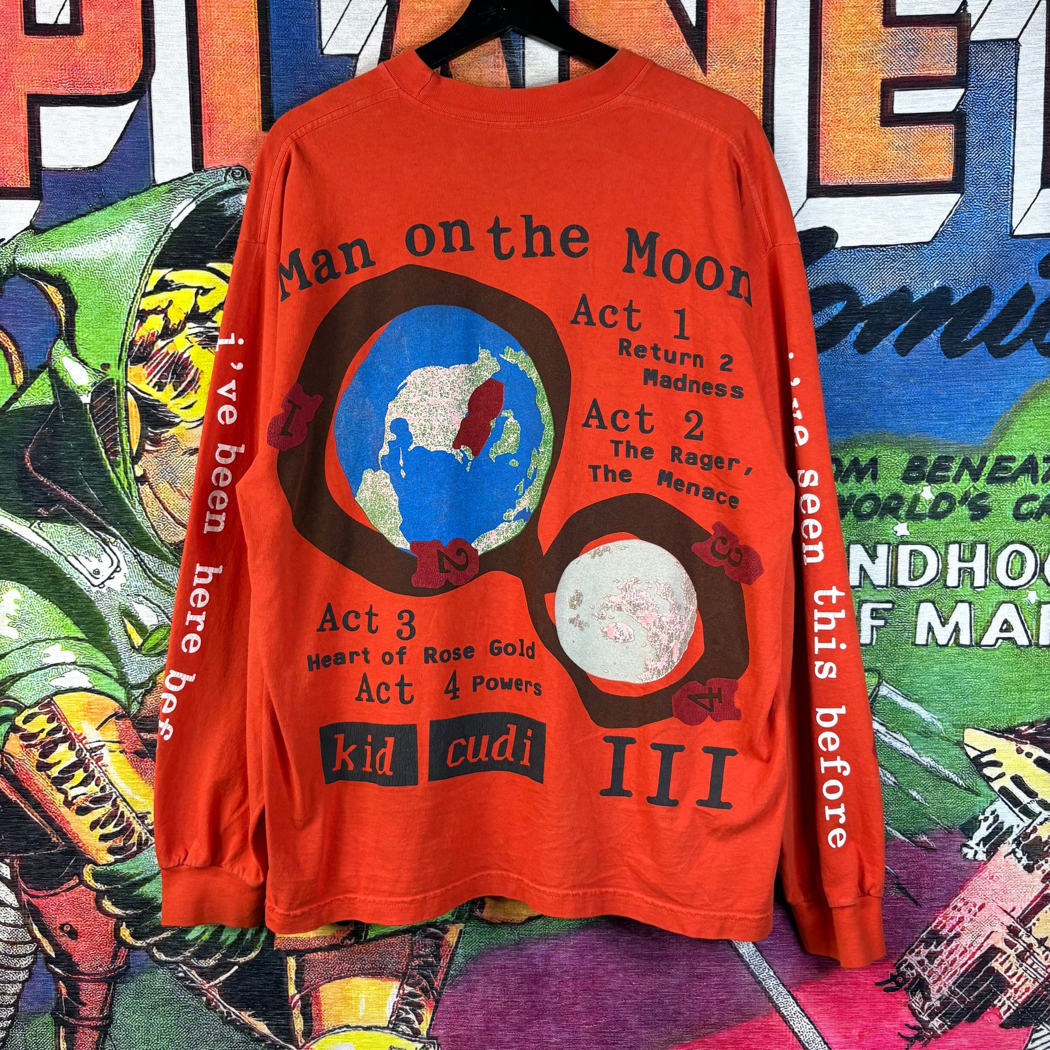 This is a highly desirable Kid Cudi x Cactus Plant Flea Market (CPFM) "Man on the Moon III" long-sleeve tee in a vibrant orange. The front features bold text and a striking dalmatian-print moon graphic, while the back details the album's acts with Earth and moon imagery and sleeve prints read "I've been here before" and "I've seen this before." This piece is an authentic 2021 collector's item and a fantastic blend of high-end streetwear and music memorabilia.