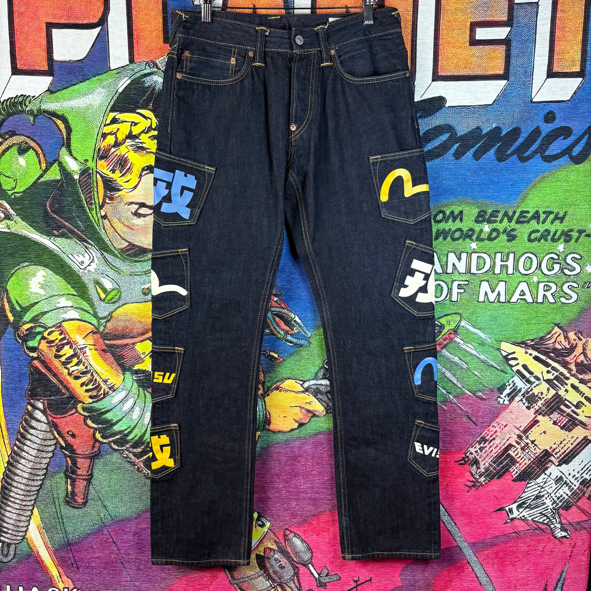 they are a striking pair of Evisu cargo denim jeans, blending a dark wash with bold, colorful graphics and signature logo appliqués on multiple pockets. The design features the iconic Evisu gull wing on the back pockets, making them an instantly recognizable and highly collectible piece of Japanese streetwear.