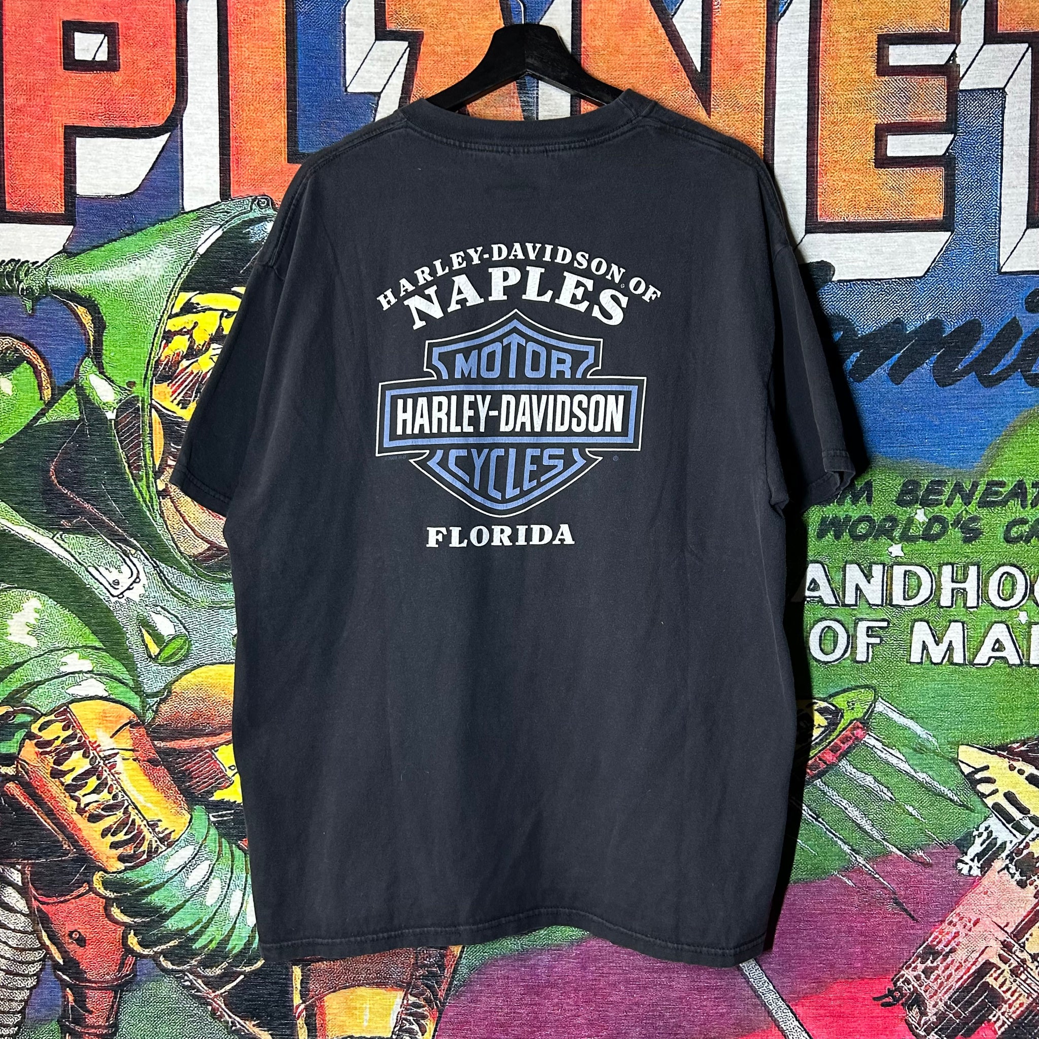 Ride in style with this vintage Harley Davidson Naples tee. Made with the highest quality materials, this shirt showcases your love for motorcycles and streetwear. The perfect addition to your wardrobe and a must-have for any Harley Davidson enthusiast. Size XL available now.