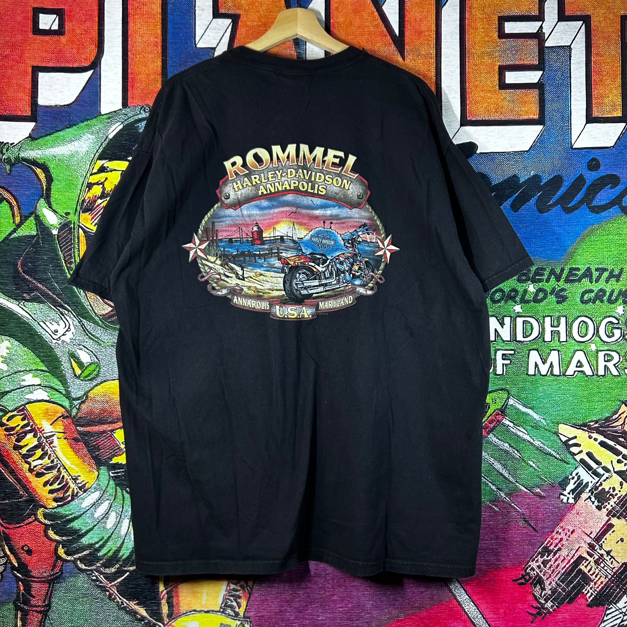 Harley Davidson Motorcycles Annapolis Maryland 2012 Tee Featuring Bold Red Graphic that says ‘Temptation’ and big face Devil on the front and the back has a peaceful scenic beach and bike route graphic. Perfect for any fans of Harley Davidson a chance to get this limited tee.