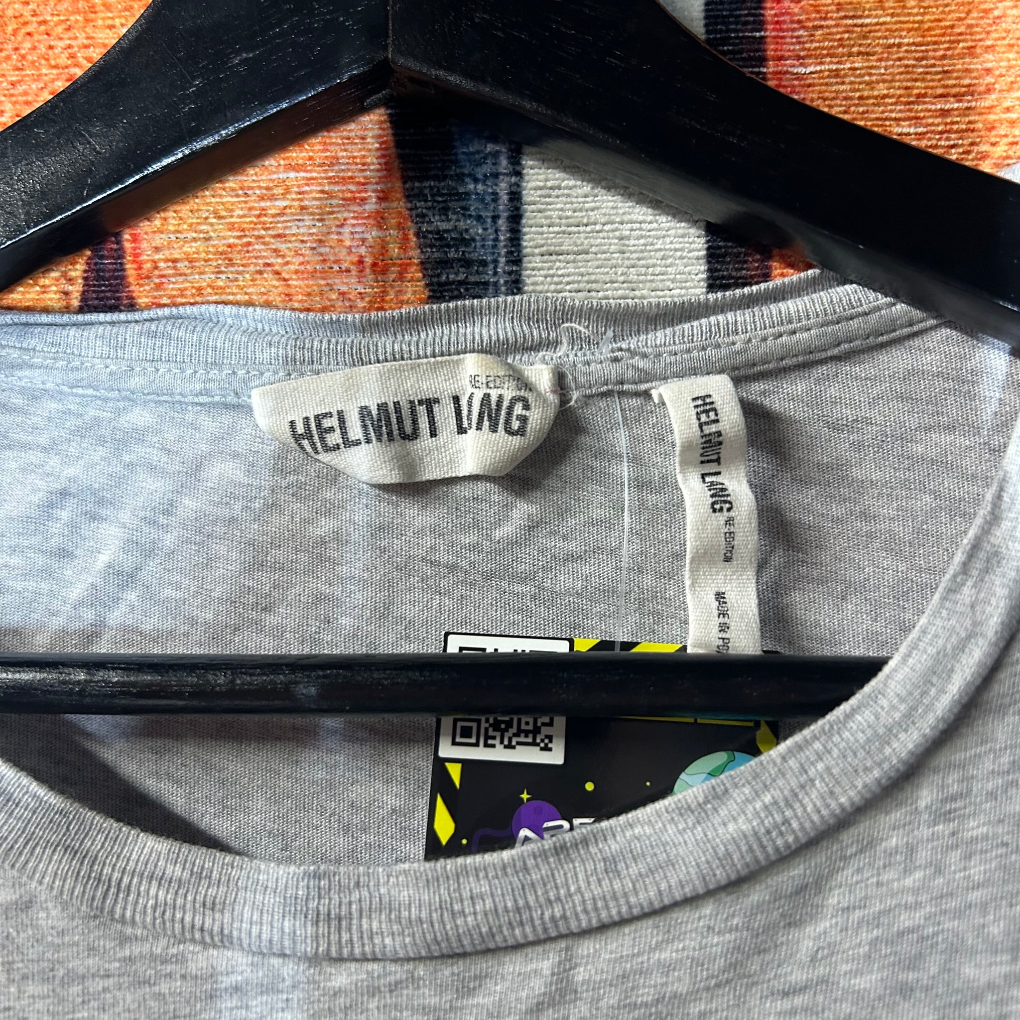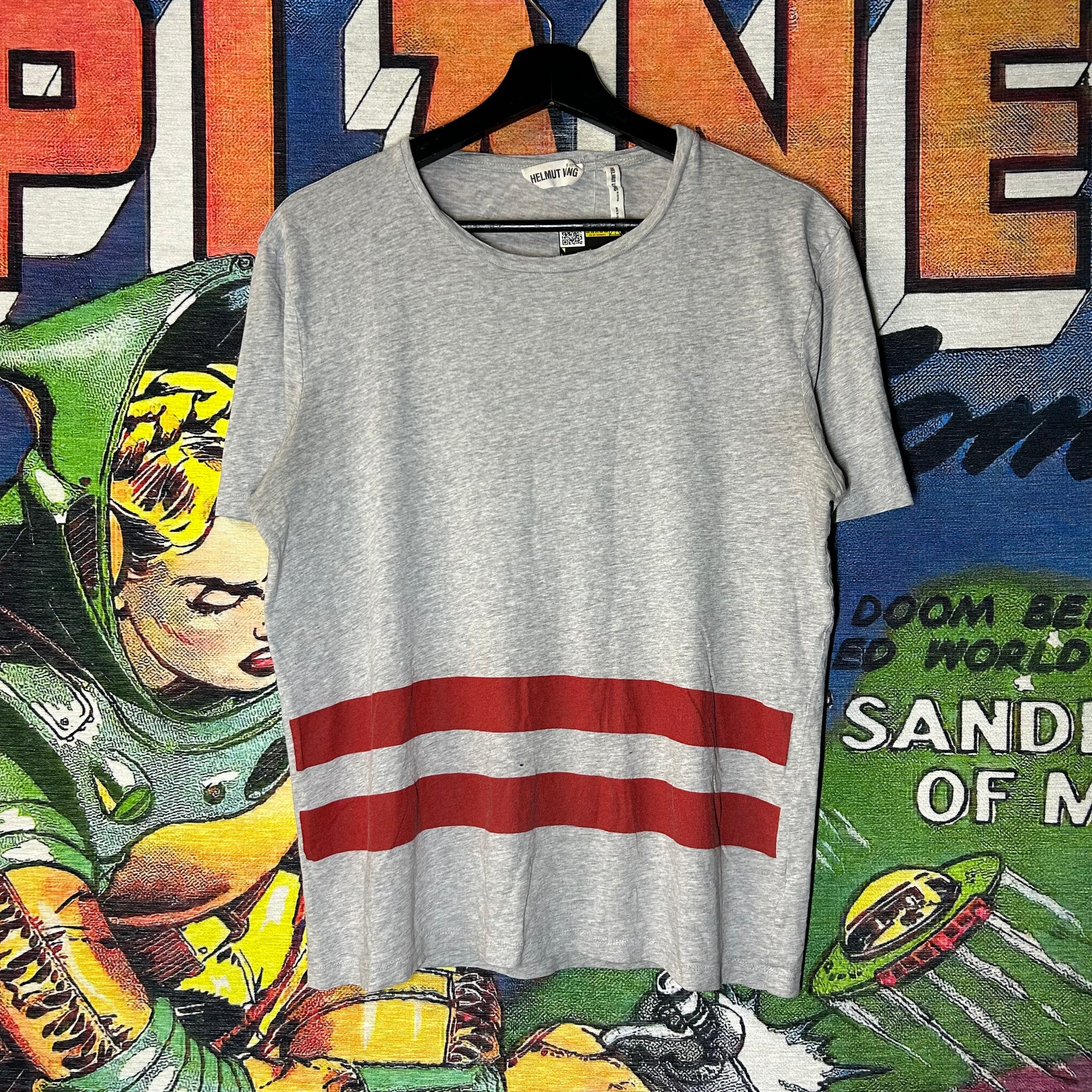 Minimalist Helmut Lang tee featuring a bold horizontal red stripe across the chest. Crafted from soft cotton with a boxy, cropped silhouette — a clean, elevated staple from the iconic label.