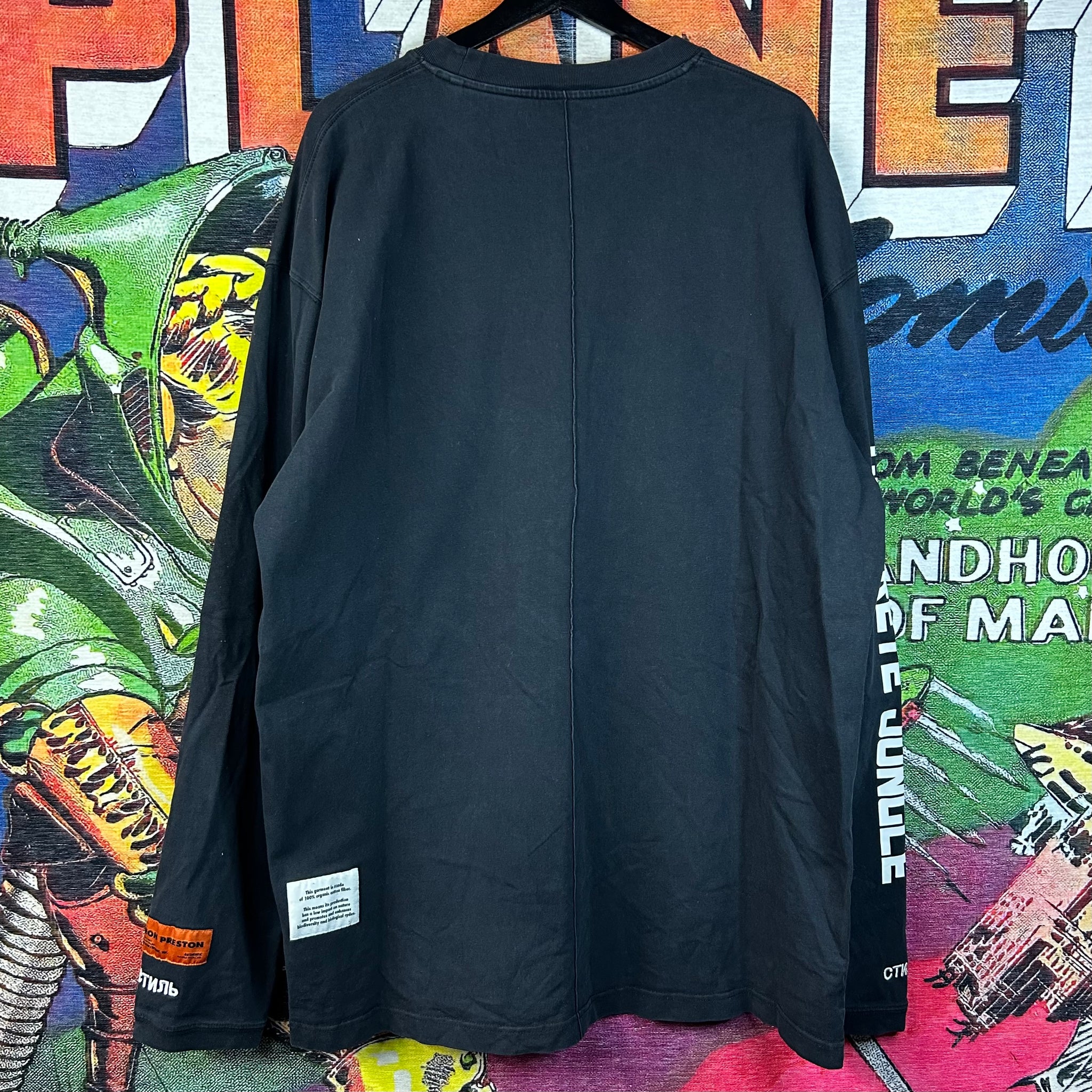 Heron Preston “Birds” Long Sleeve Tee Size XL. Features the signature Heron Preston design with bold bird graphics across the front and sleeves. Crafted from premium cotton for a relaxed streetwear fit. A standout piece for any contemporary fashion collection.