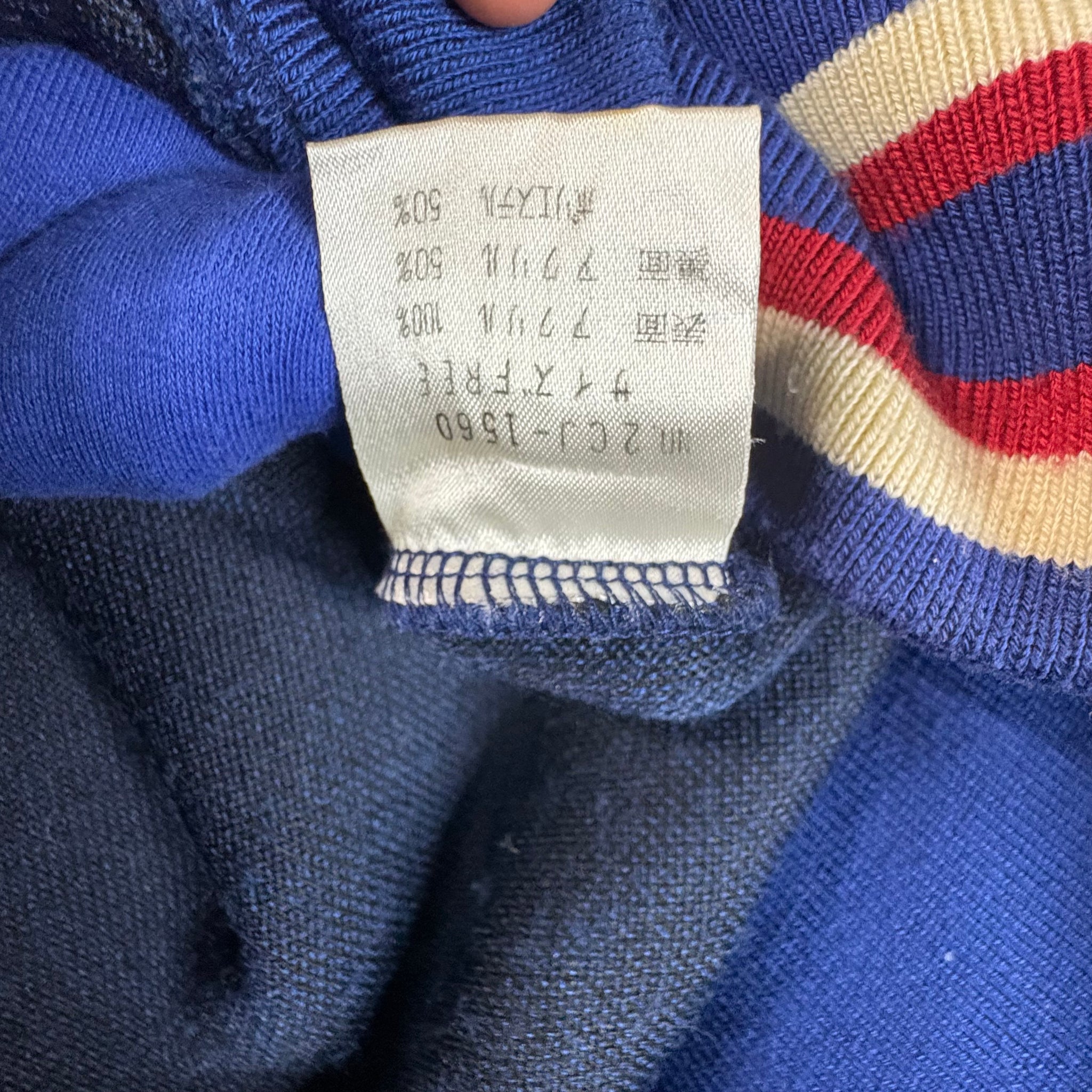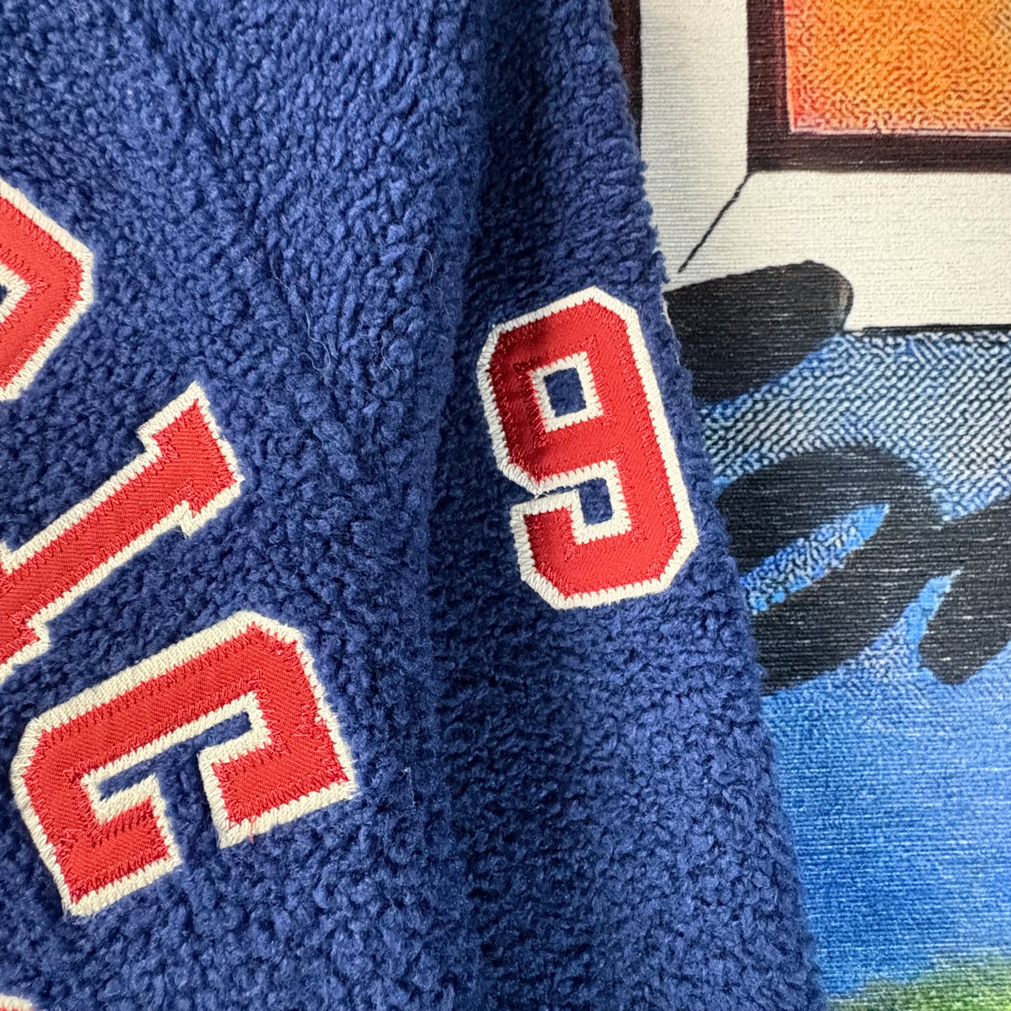 This Hysteric Glamour varsity jacket features a bold blue fleece body accented with red and white striped ribbed cuffs, collar, and hem, giving it a classic collegiate vibe with a streetwear edge. The piece has a snap-button front closure, long sleeves, and a structured yet relaxed fit that enhances its varsity aesthetic. Its color-blocked details and clean lines make it a standout layering piece for casual or statement styling.