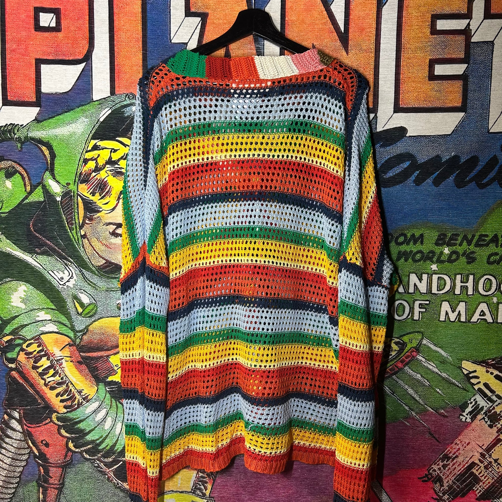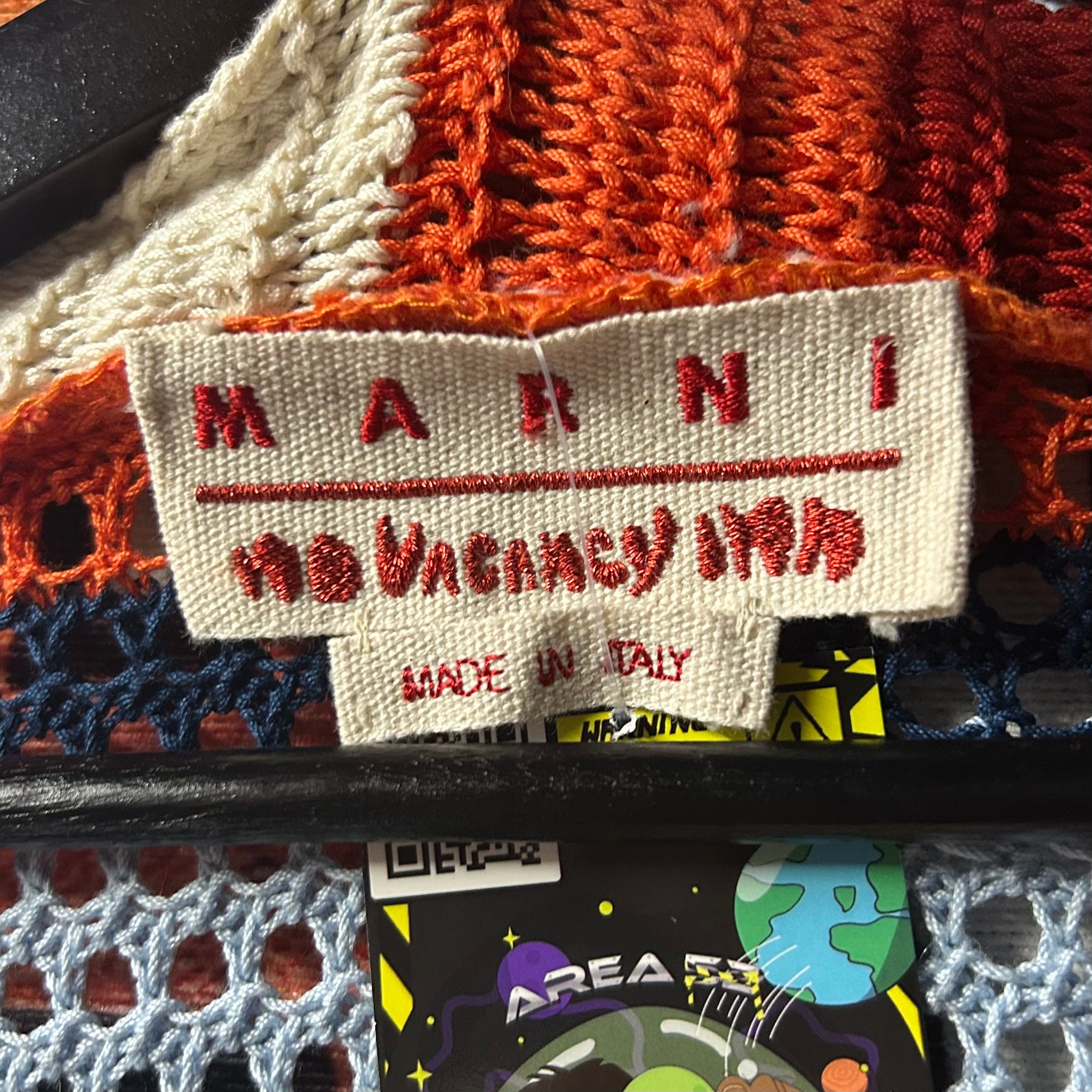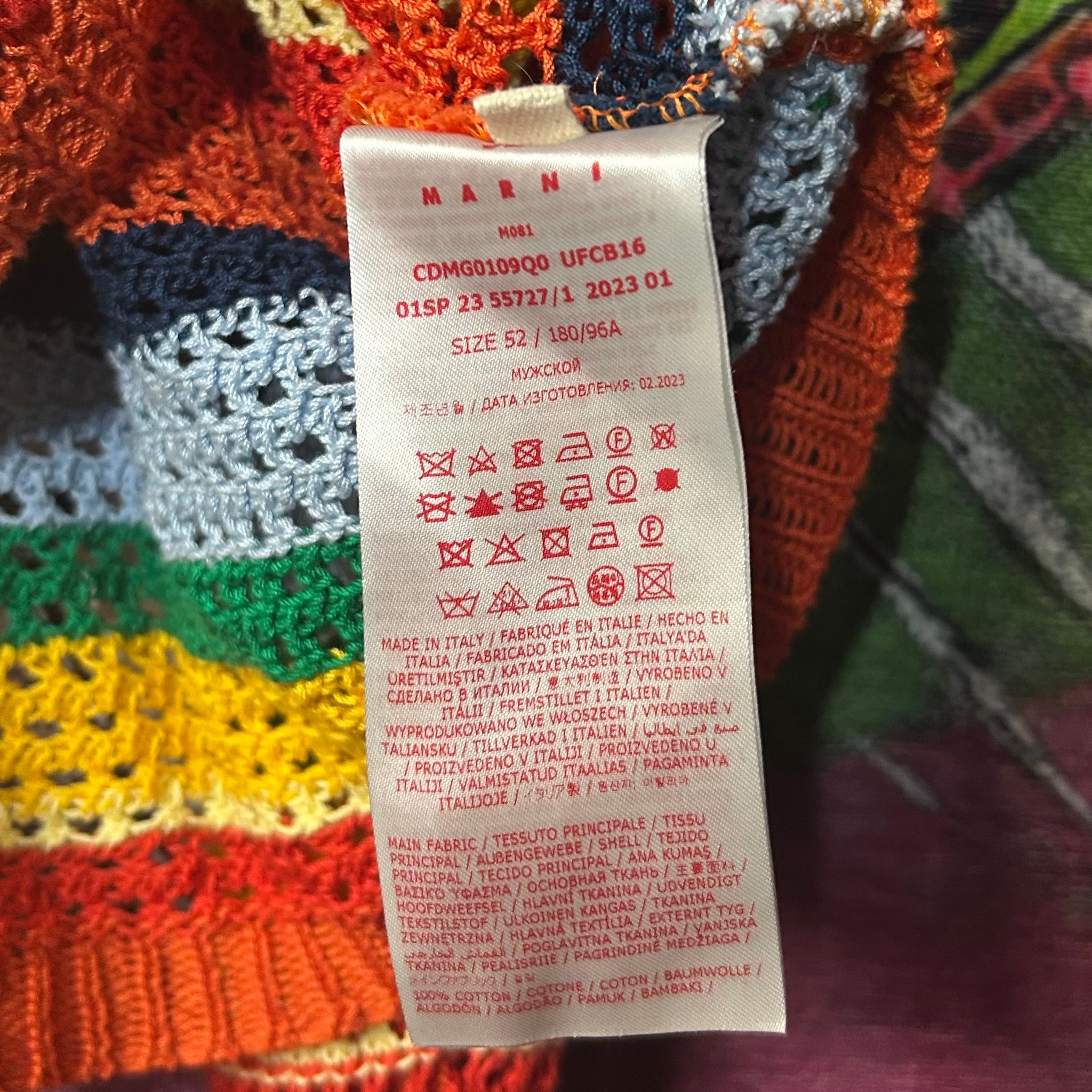 Vibrant multicolor striped crochet cardigan from the Marni x No Vacancy Inn collaboration. Lightweight knit with a bold retro palette and open weave. Statement piece with laid-back luxury.