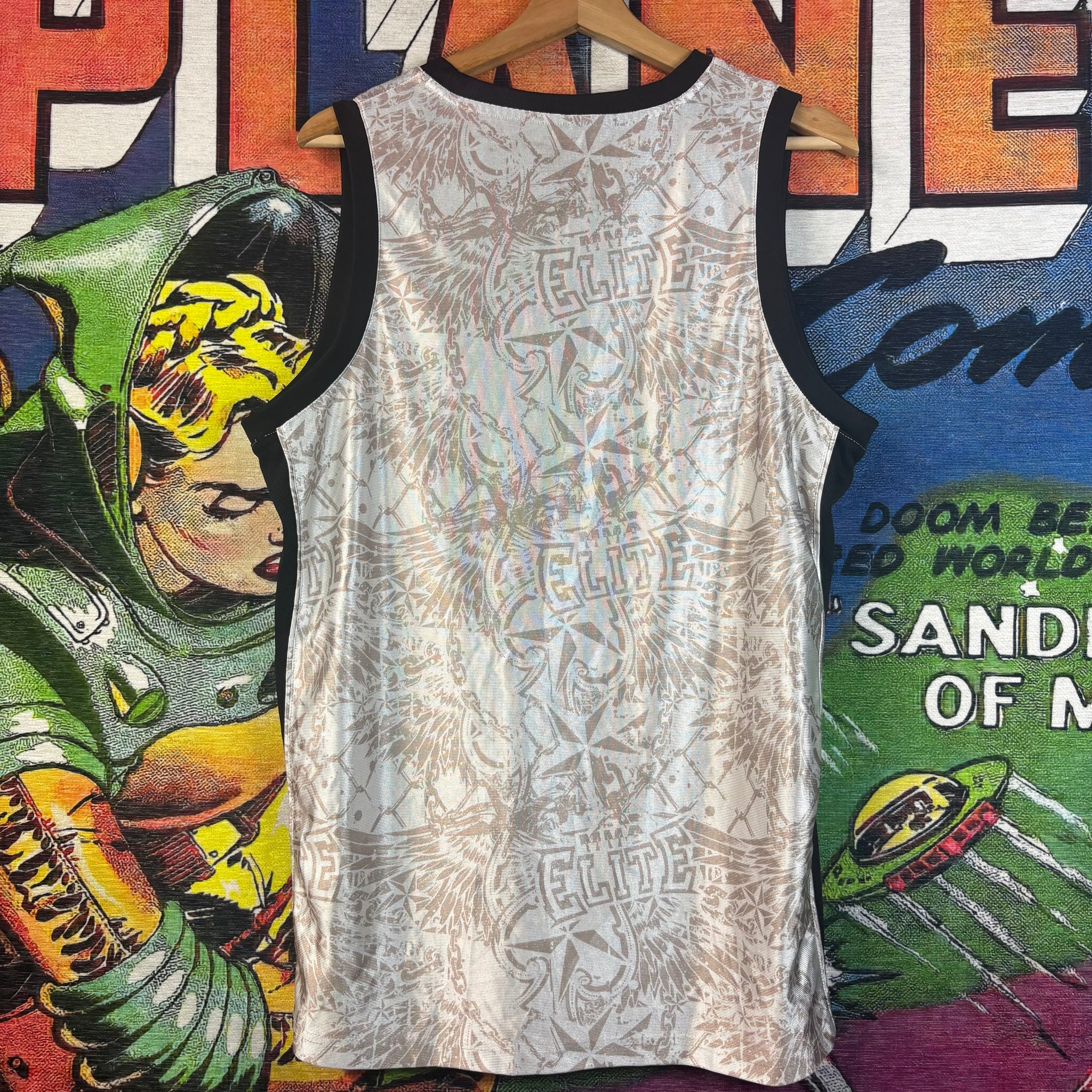 Command attention in the gym or cage with this MMA Elite tank top, featuring a striking all-over pale beige and white graphic print that evokes a sense of intensity and action. Contrasting black side panels and trim frame the bold, centered "MMA ELITE" logo, making this a fierce and eye-catching addition to any fight wear collection.