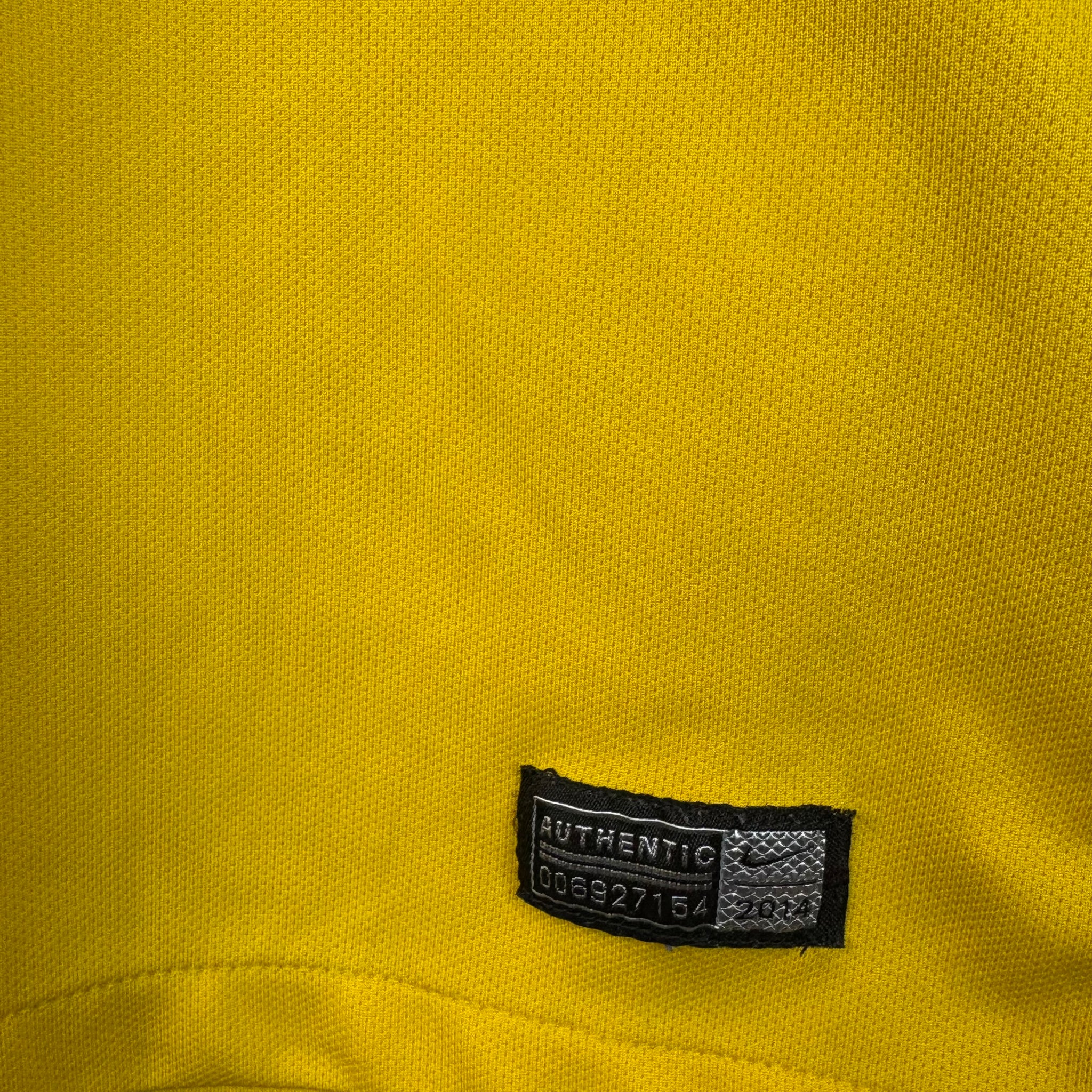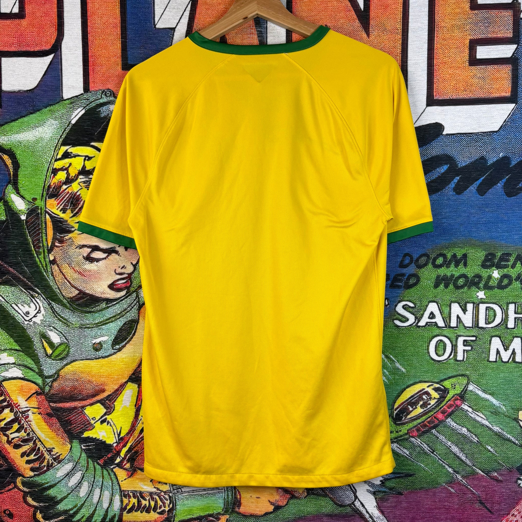 This striking Brazil national team jersey features the iconic yellow color with green trim on the collar and sleeves, immediately recognizable worldwide. The chest proudly displays the CBF crest adorned with five stars above a Nike swoosh, signifying a classic piece of football history.
