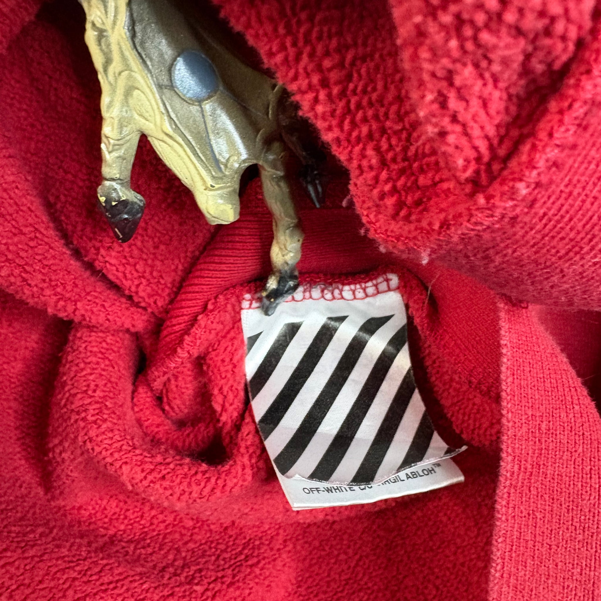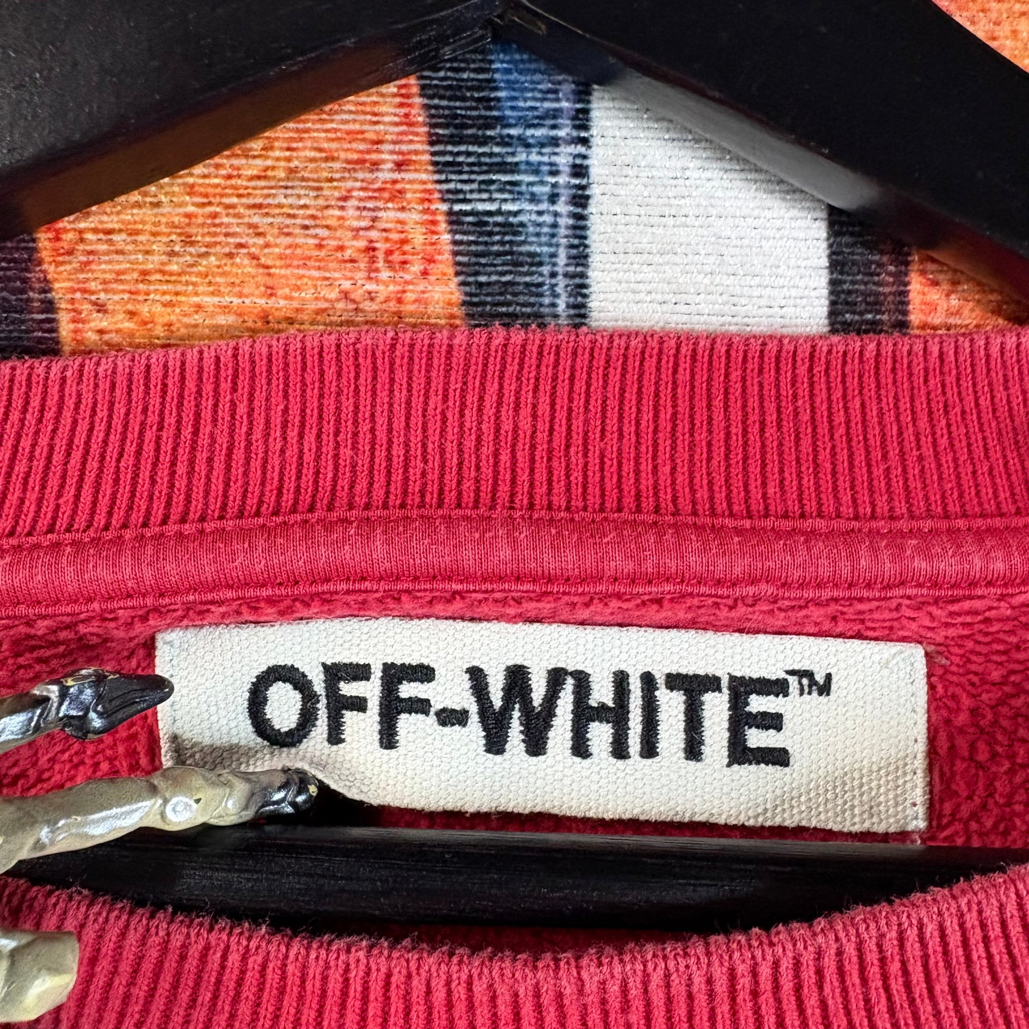 Get ready to make a statement with this authentic Off-White crewneck sweatshirt in a rich, eye-catching red. It features the brand's iconic, high-contrast style with bold yellow diagonal stripes running down both sleeves and across the jagged, raw-cut bottom hem for an unmistakable street-fashion look.