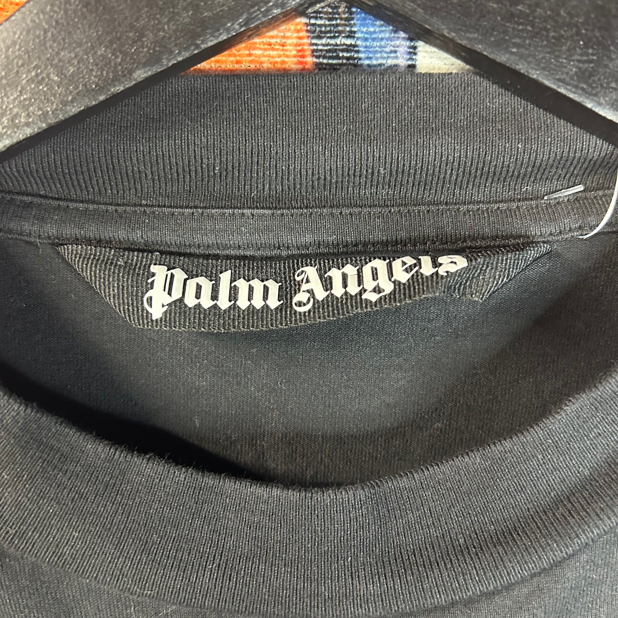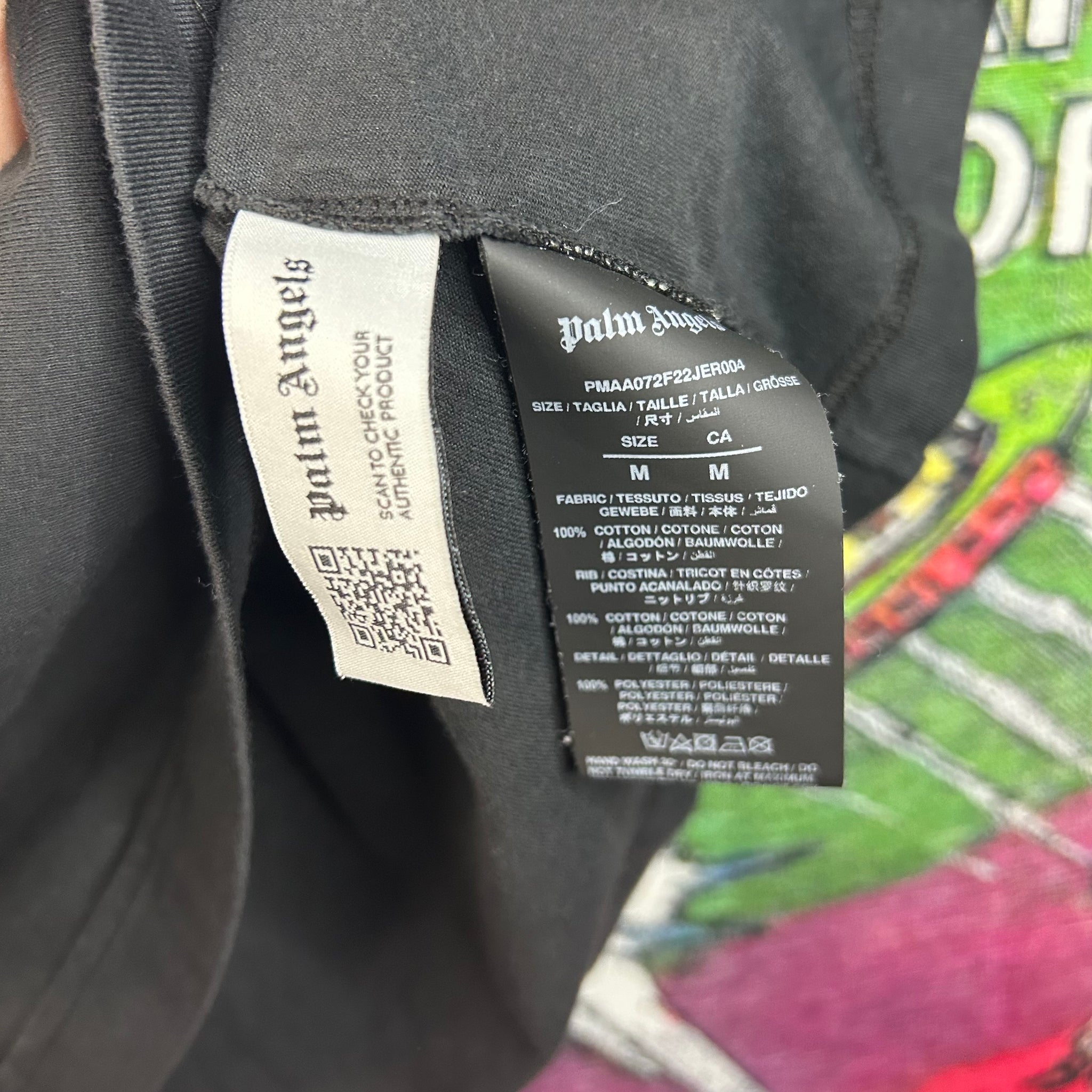 Palm Angels Flames Tee in Size Medium. Bold design featuring the iconic Palm Angels logo with flame detailing, giving the piece a striking streetwear edge. A statement tee that blends luxury fashion with skate-inspired culture.