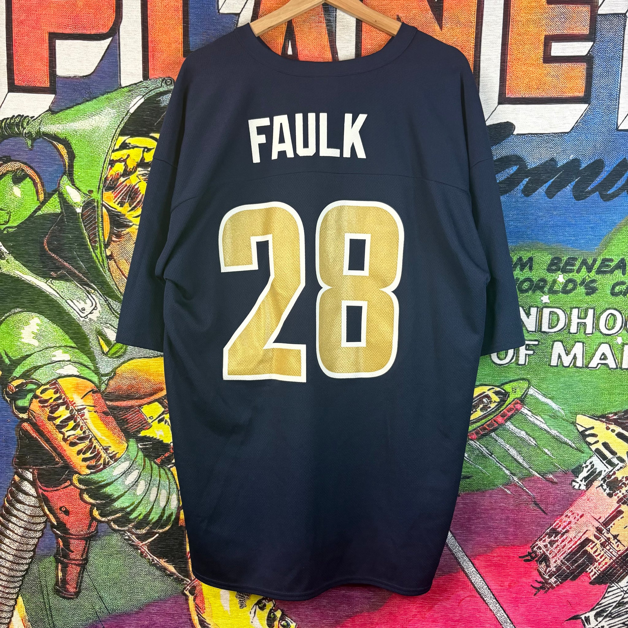 Own a piece of football nostalgia with this striking navy blue jersey, featuring a bold gold and white number 28 prominently displayed on both the front and back. The jersey is personalized with the name FAULK across the shoulders, making it a distinctive and eye-catching piece for any fan or collector.