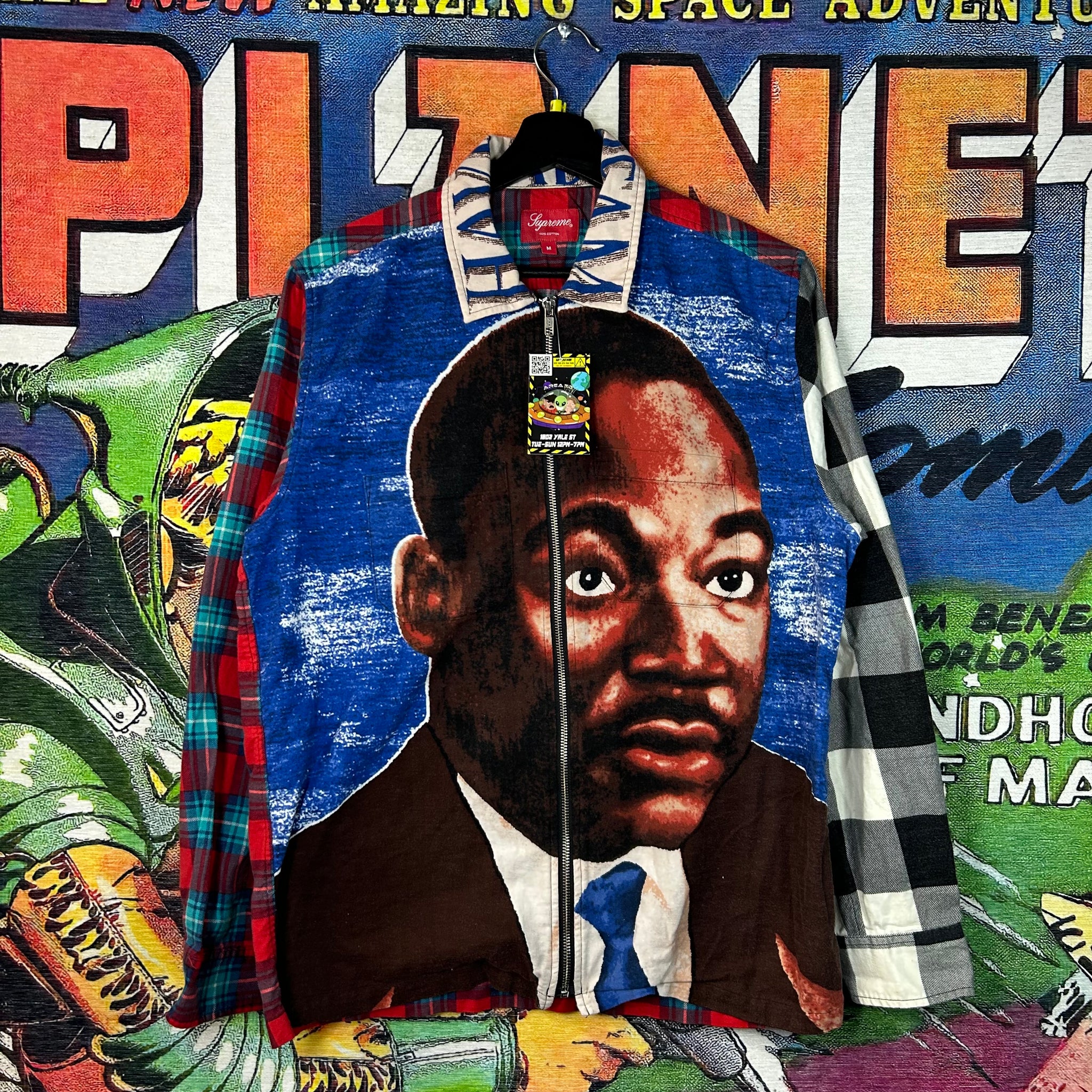 Unique Supreme flannel shirt featuring a full front zip closure and tribute to Martin Luther King Jr. Soft flannel construction with a classic plaid pattern. A standout and rare Supreme piece. In good pre-owned condition.