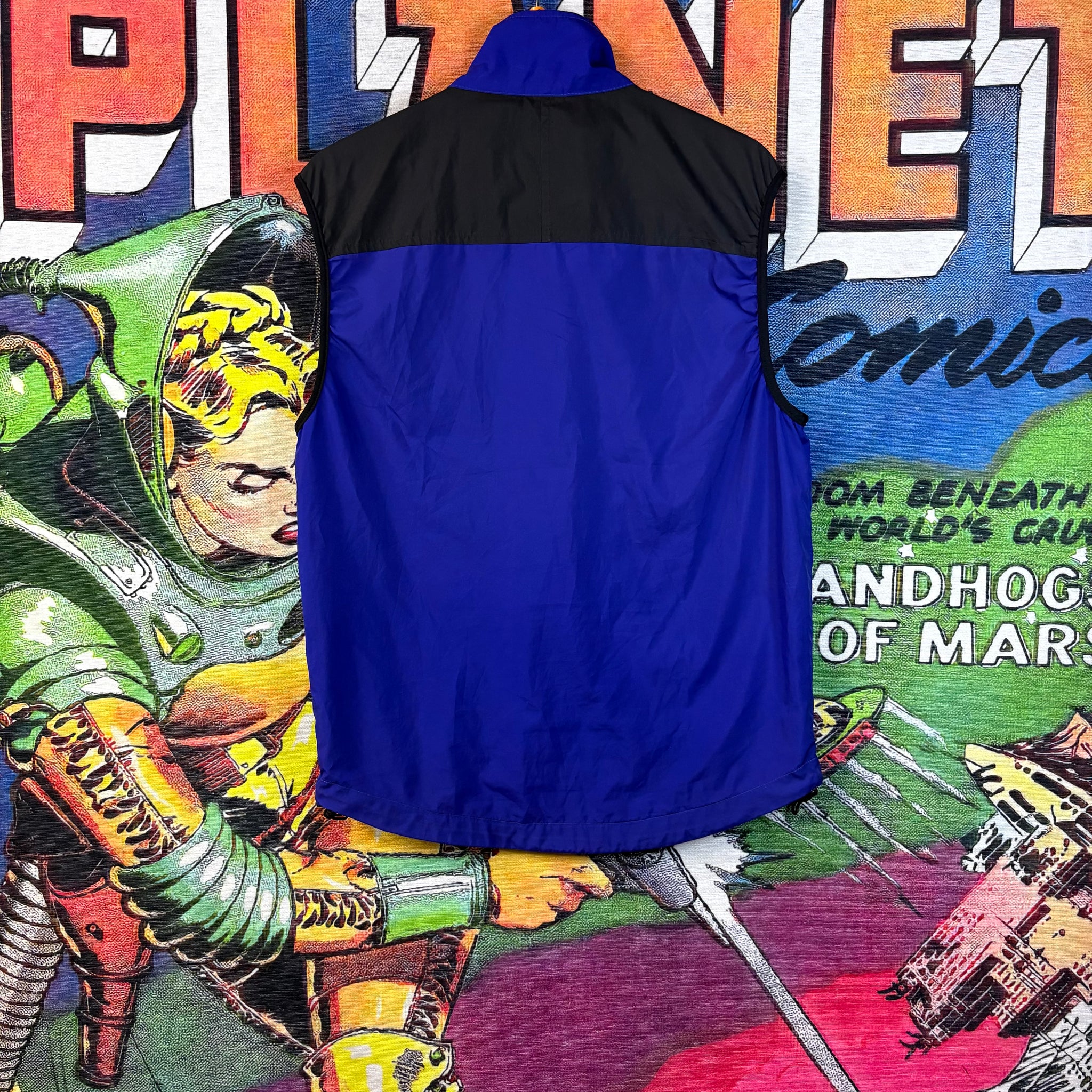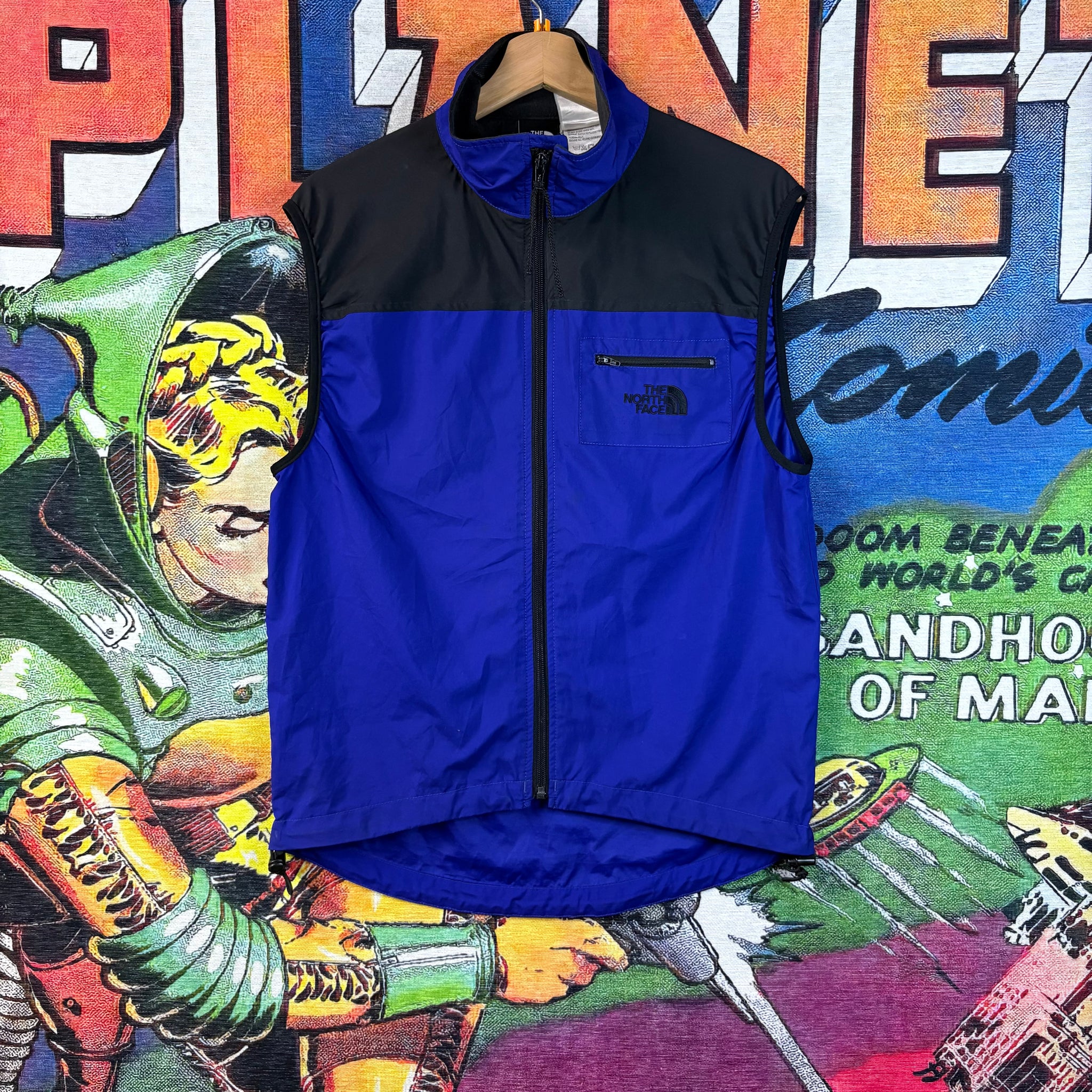 A versatile layering piece, this The North Face vest features a classic blue and black colorway with a lightweight, durable design. Perfect for outdoor adventures or casual streetwear styling. Size small.