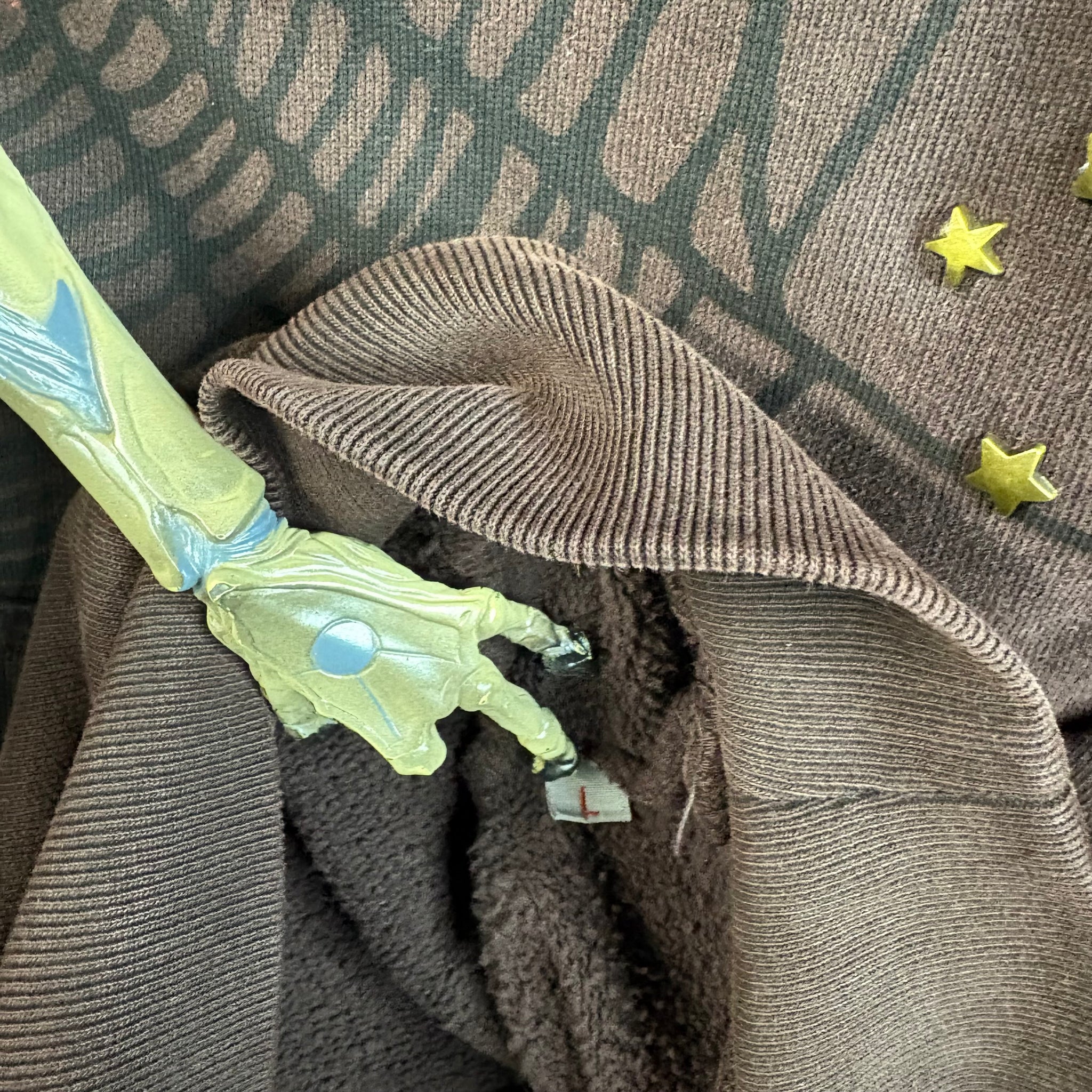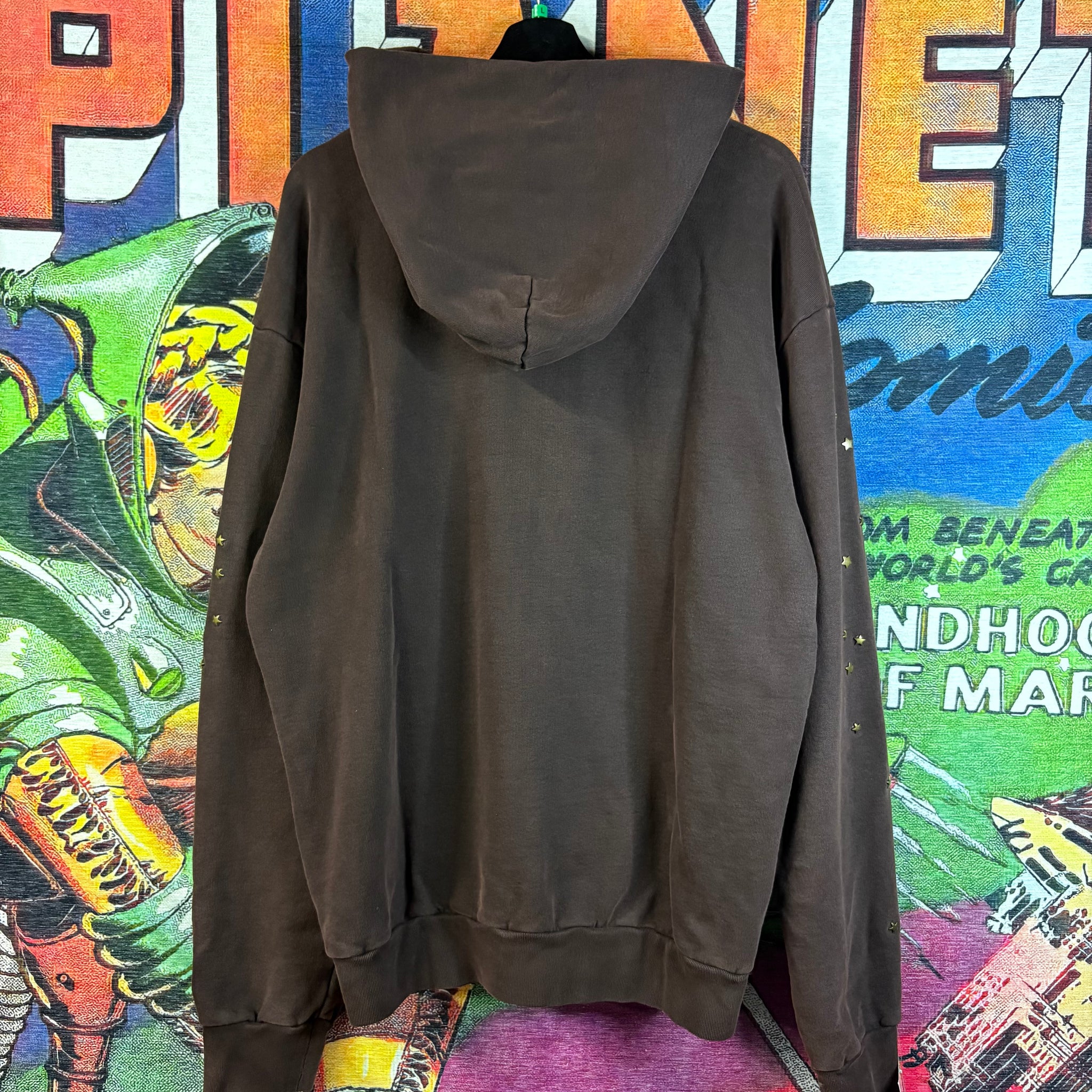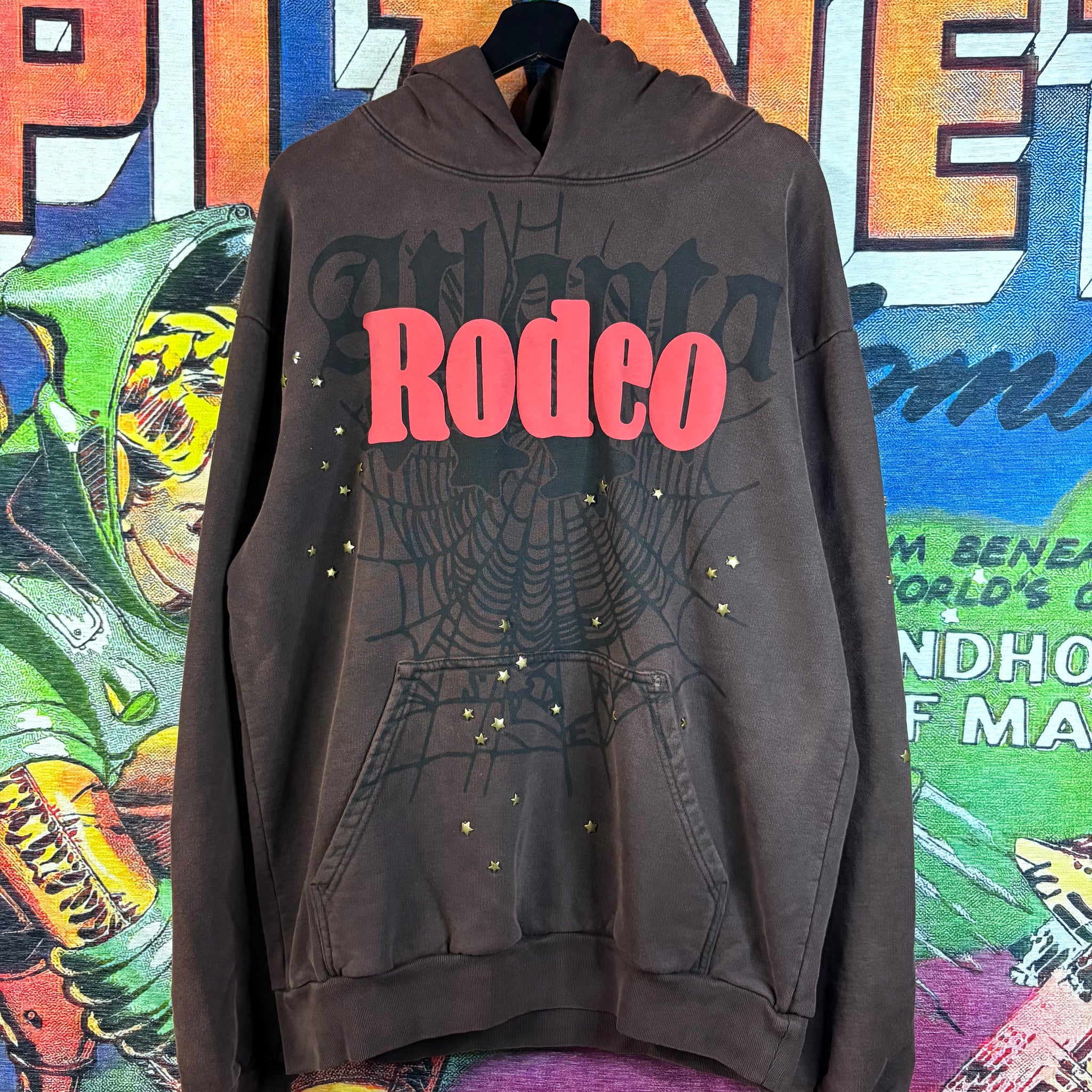 This Hoodie Featutres washed-out dark brown that captures a true vintage aesthetic. The front graphic is a bold statement with the word "Rodeo" in bright red, overlaid on a black spiderweb design sprinkled with unique gold star embellishments