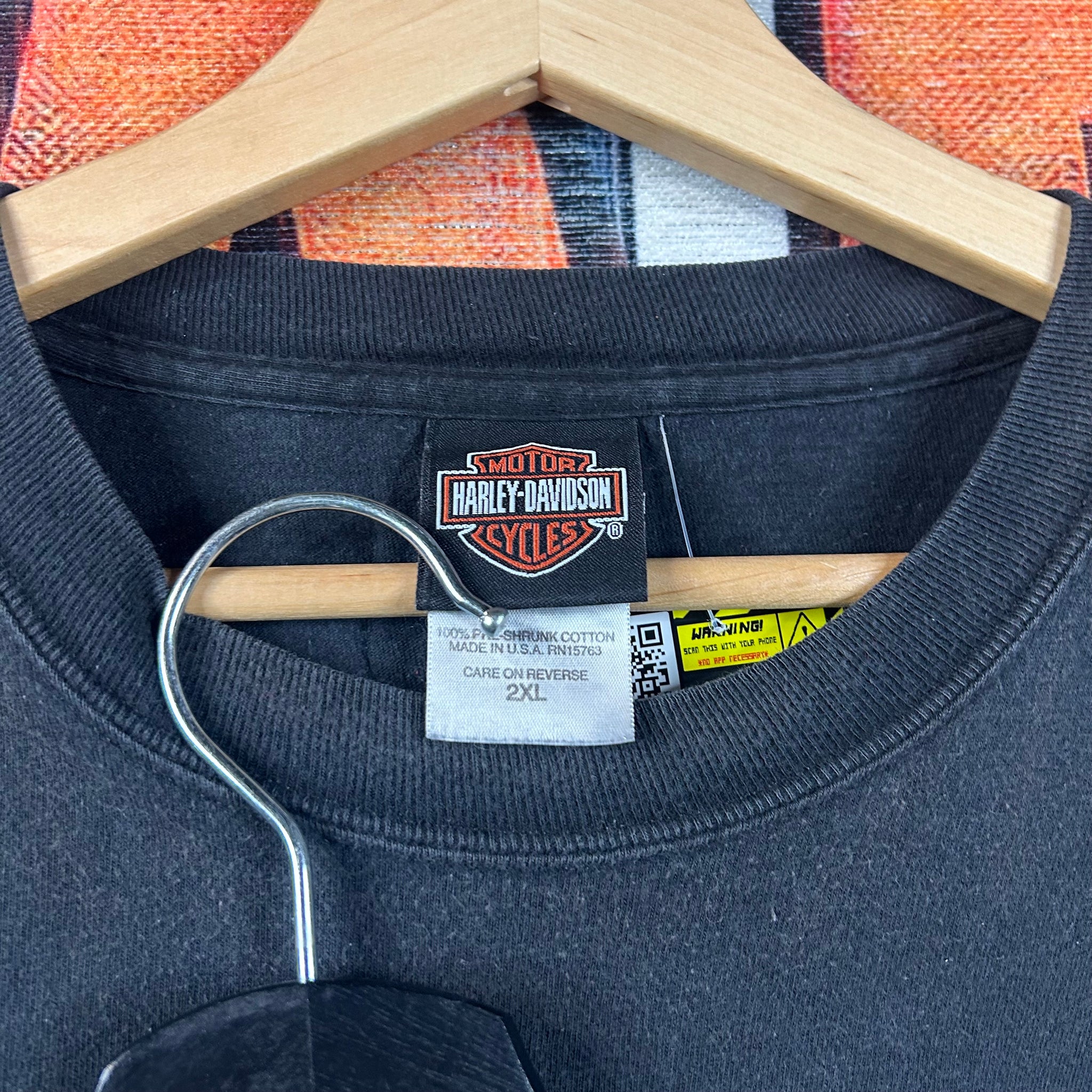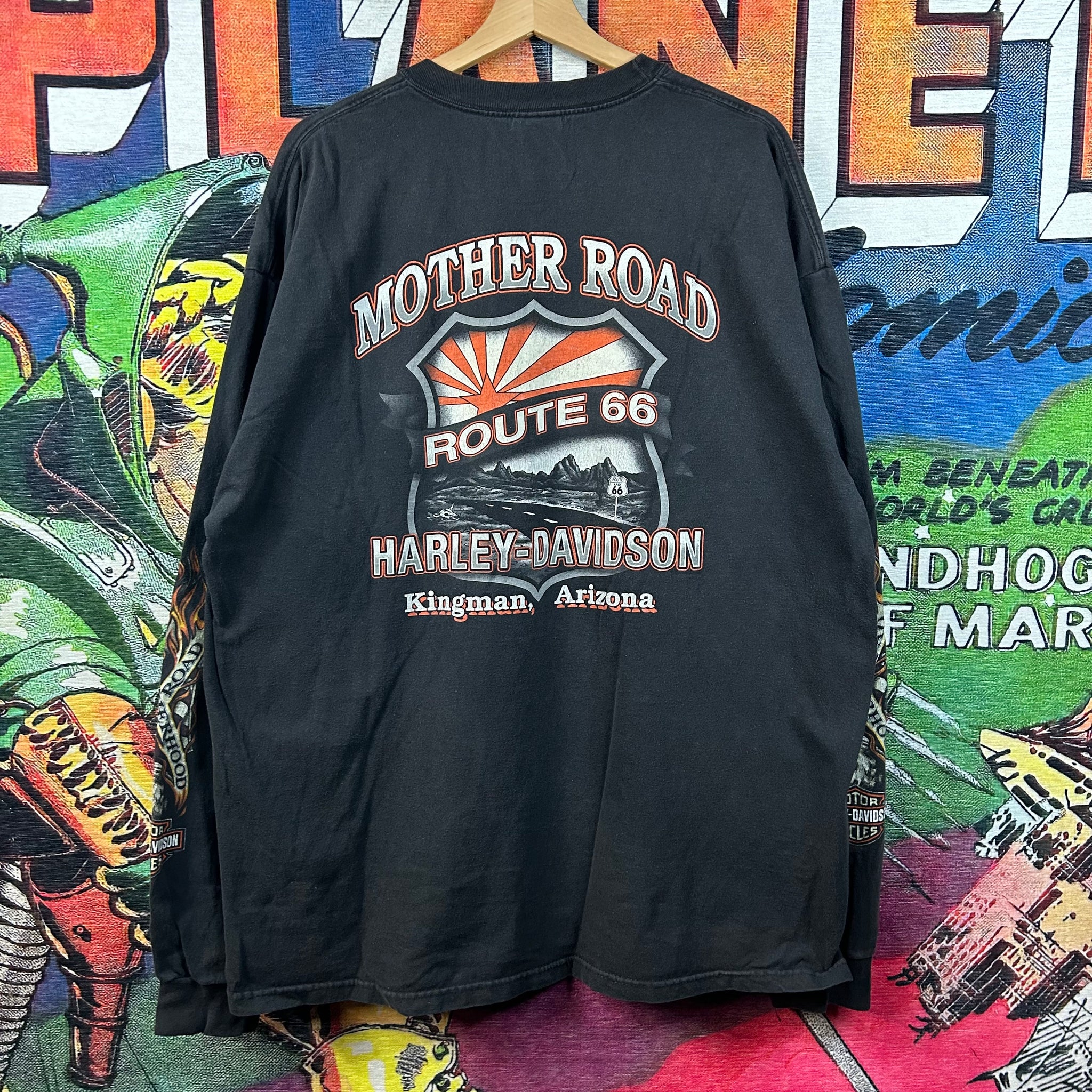 This Harley Davidson long sleeve tee from the 2000s is too clean! The fading on the graphics and the decals on the sleeves as well as the pocket just make this shirt too hard!