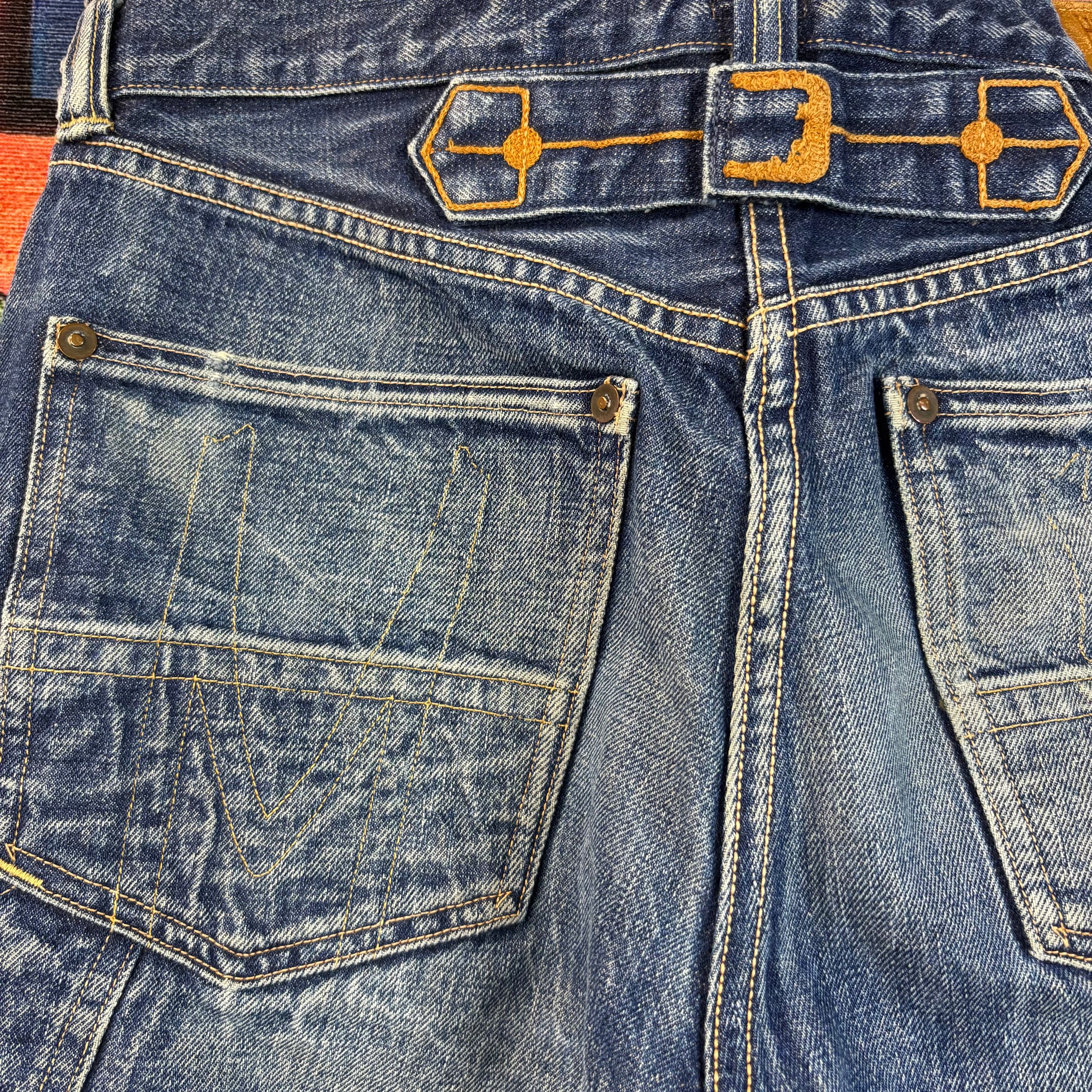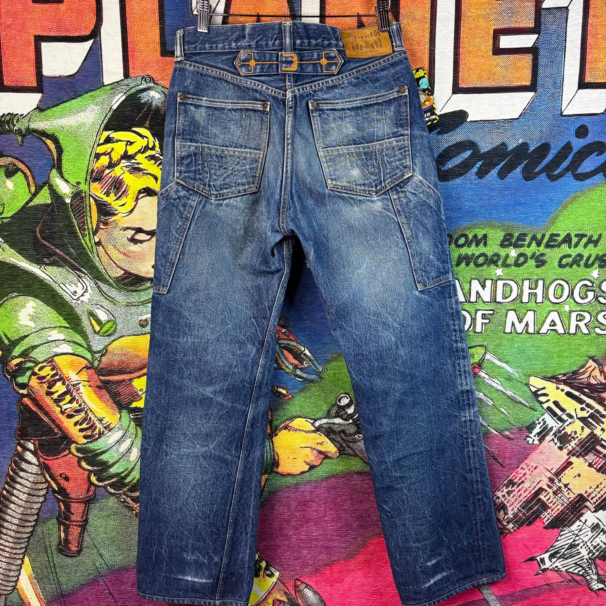 these classic denim jeans feature a faded, medium-blue wash with authentic whiskering and creasing that gives them great character. The timeless straight-leg fit and visible button fly make them a staple piece for anyone looking for that true heritage denim look.
