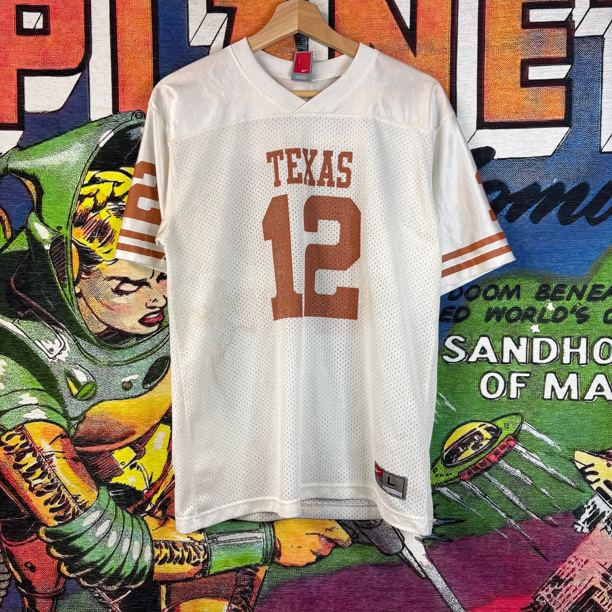 This classic Texas Longhorns football jersey in crisp, breathable white mesh stands out with its signature burnt orange accents and lettering. The front proudly displays "TEXAS" above the number "12," with coordinating stripes on the sleeves, making it a timeless piece of college sports apparel for any fan of the Longhorns.