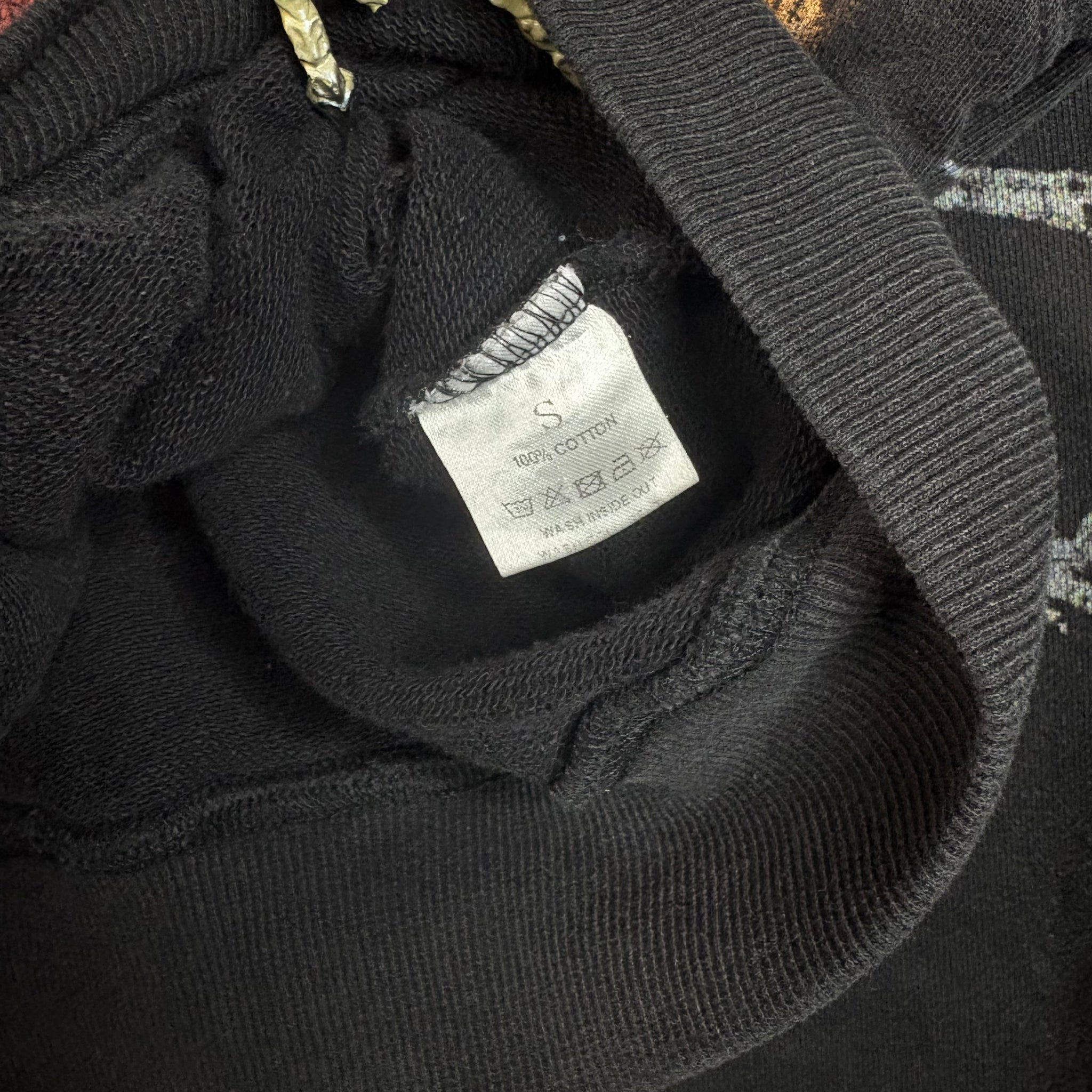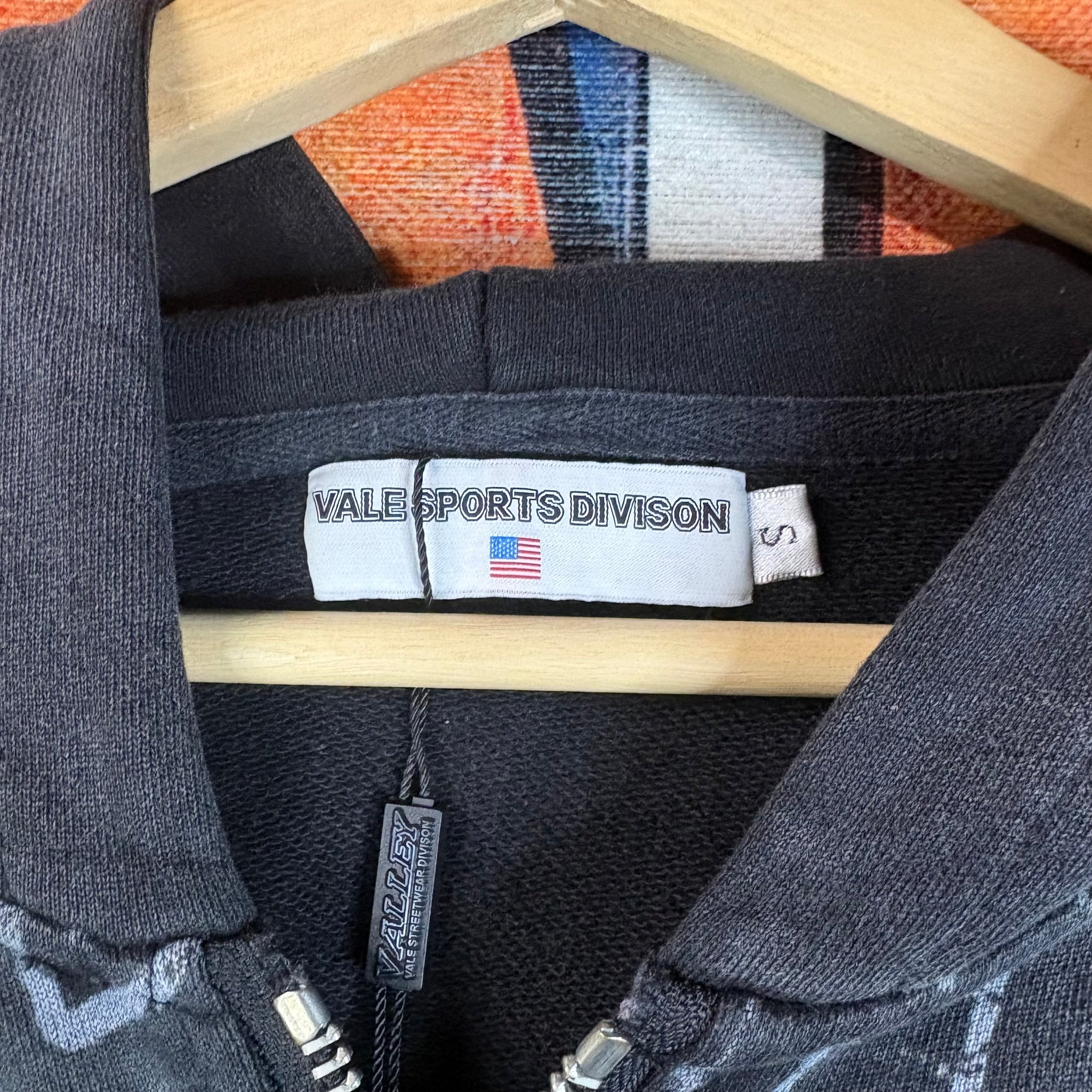Heavily distressed zip-up hoodie is an edgy statement piece, dominated by a terrifying spider graphic caught in a web and set against a fiery, post-apocalyptic sunset. Bold, faded lettering of " Valley Fest".