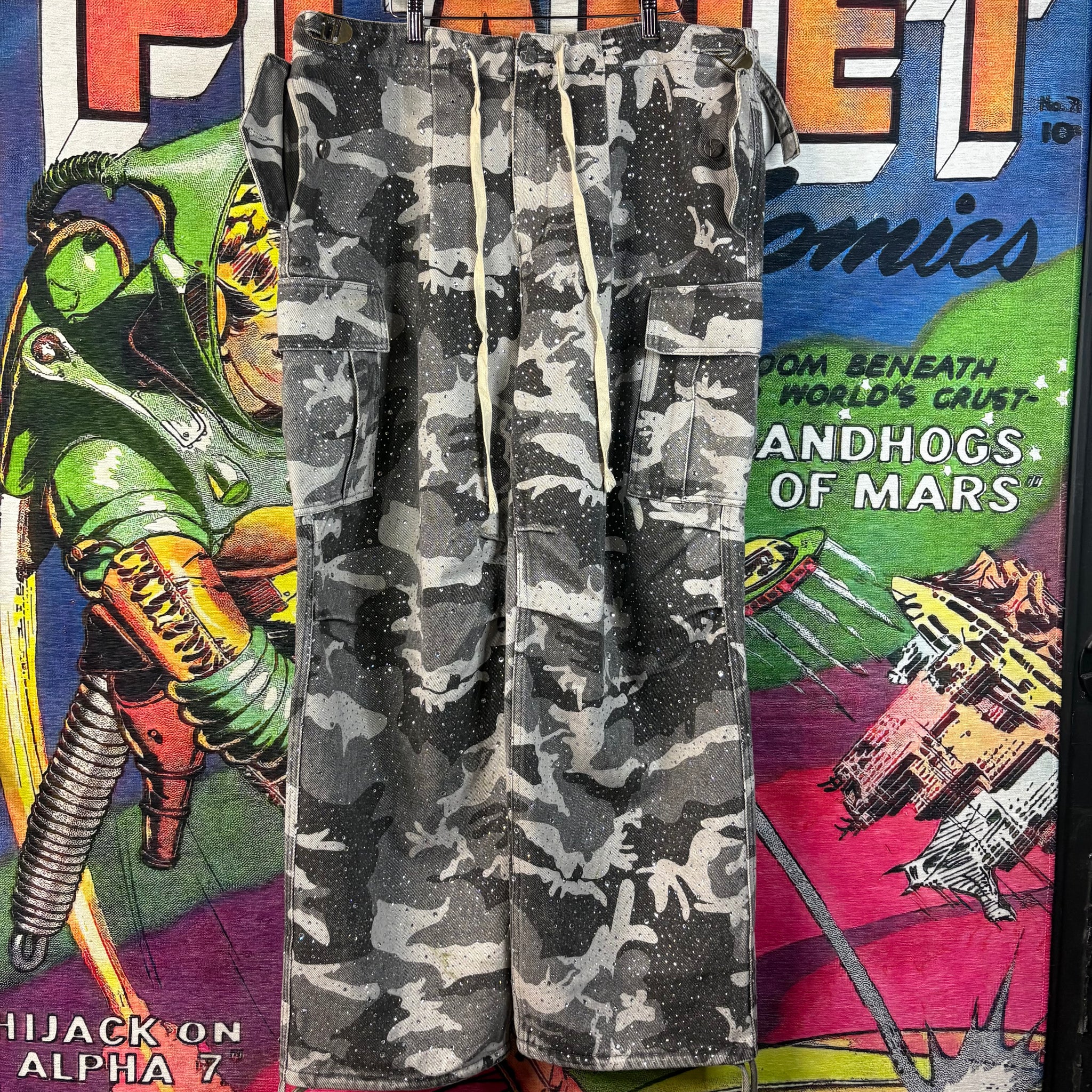 These Nice wide-leg cargo pants boast a striking monochromatic gray and black camouflage pattern, elevated by a subtle, all-over white splatter paint effect. Featuring a relaxed drawstring waist and large utility pockets, they blend rugged style with a contemporary, artistic edge.