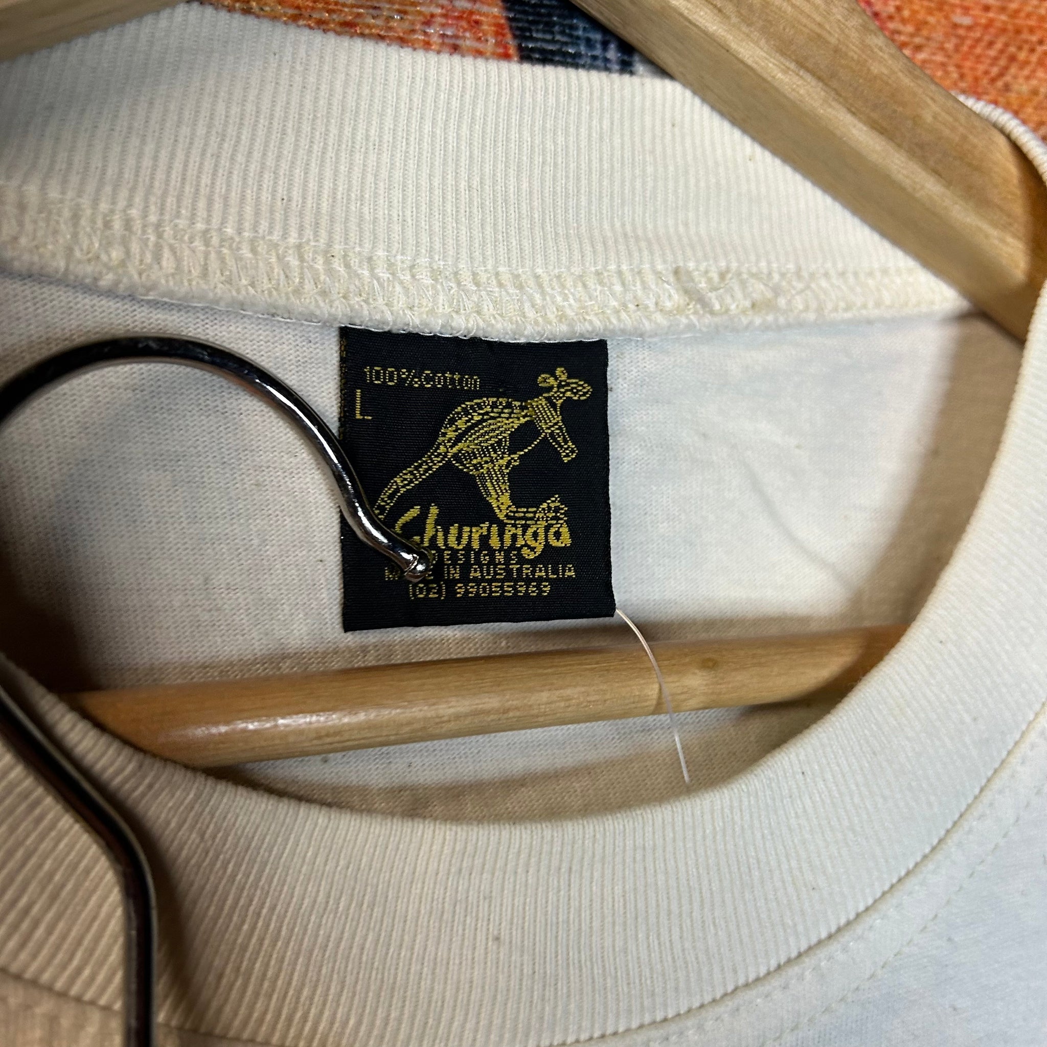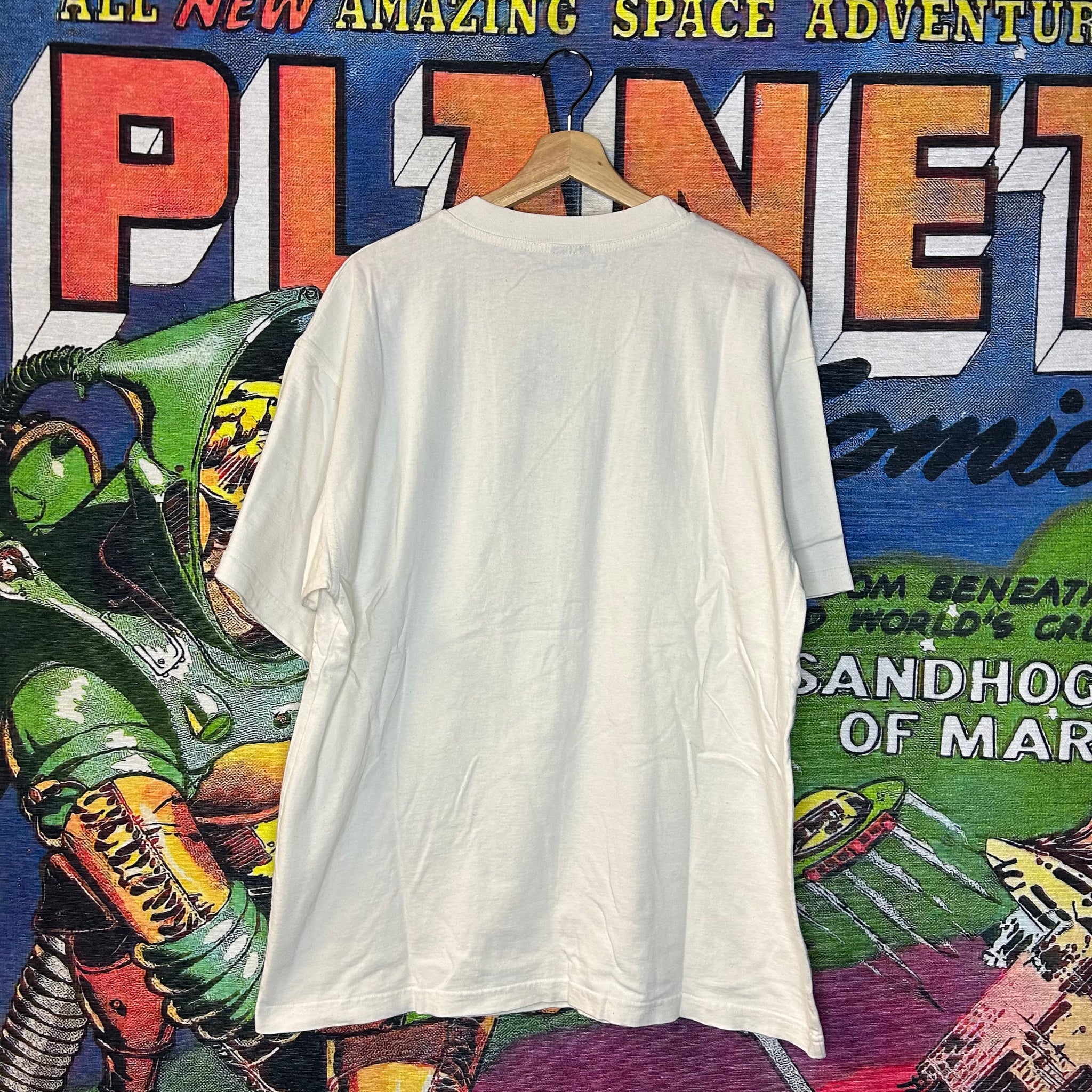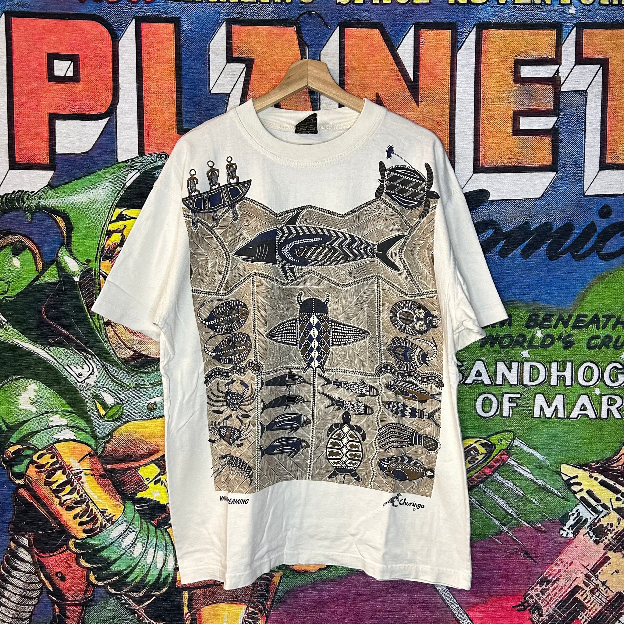 This shirt is so unique, the graphic is huge and embroidered and the art reminds me of tribal art, this tee is so 90s!