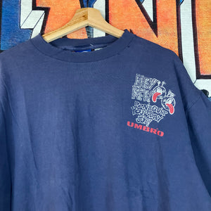 Get ready to score big with this vintage Umbro tee from the 90s. With a bold graphic design and a perfectly thrashed look, it's the ultimate addition to your collection. Perfect for fans of vintage fashion or anyone looking for a unique, edgy tee. Don't miss out on this one-of-a-kind find!