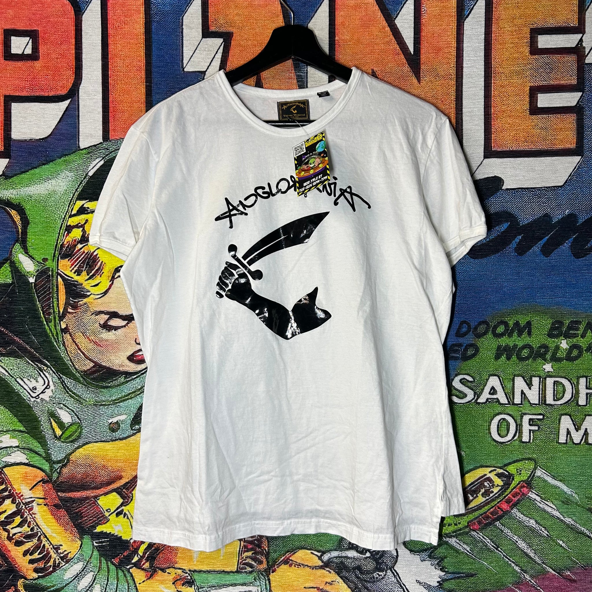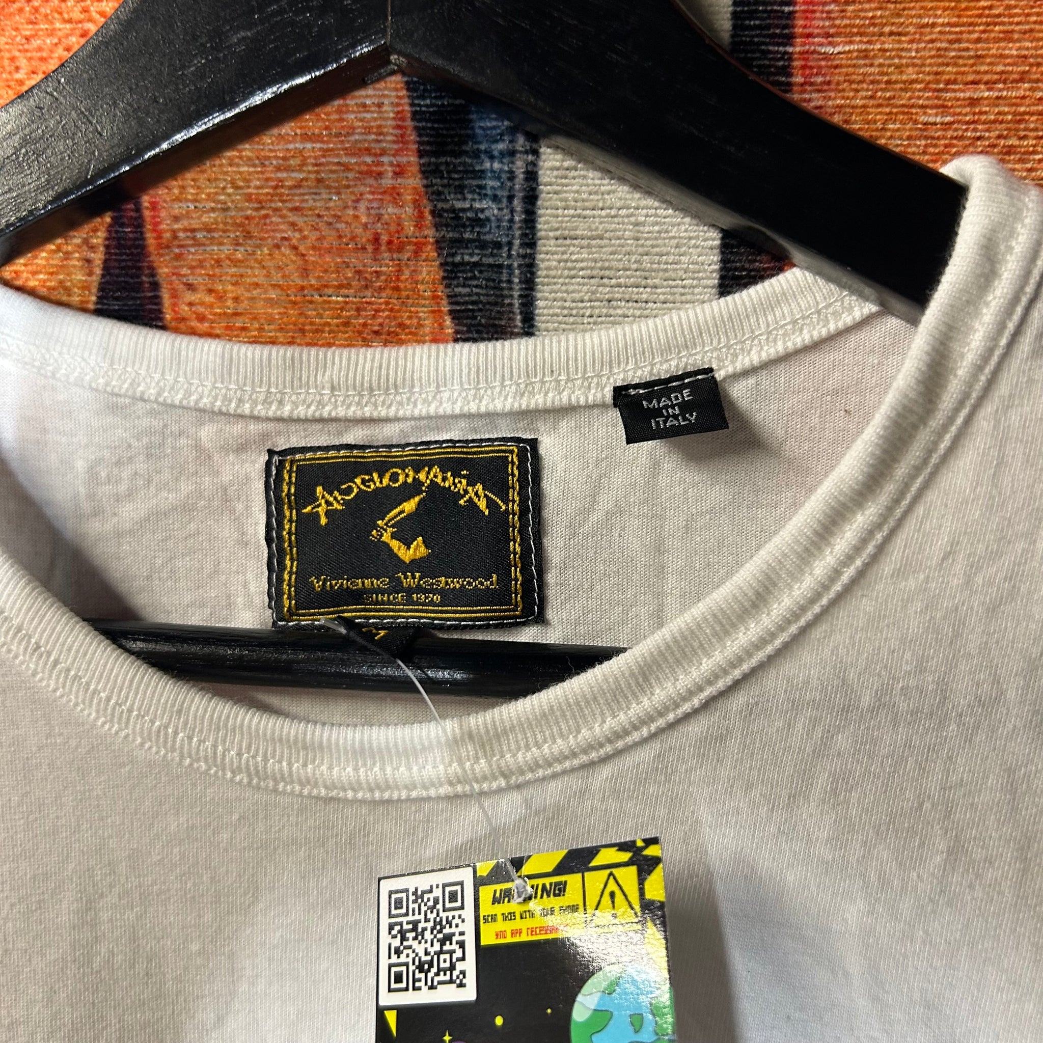 Signature Vivienne Westwood Anglomania tee in black, featuring a bold gold graphic print across the chest. Soft cotton construction with classic punk-inspired edge. A standout piece from the iconic British designer.