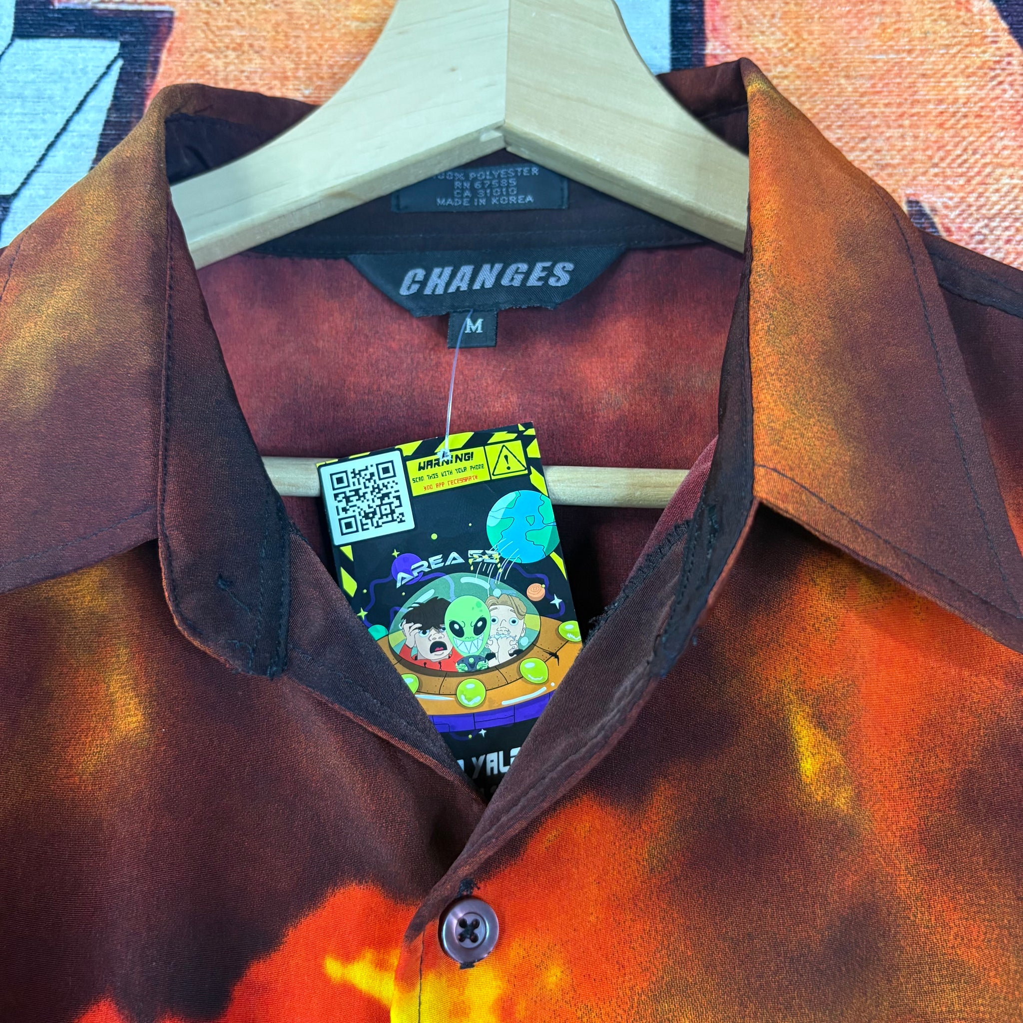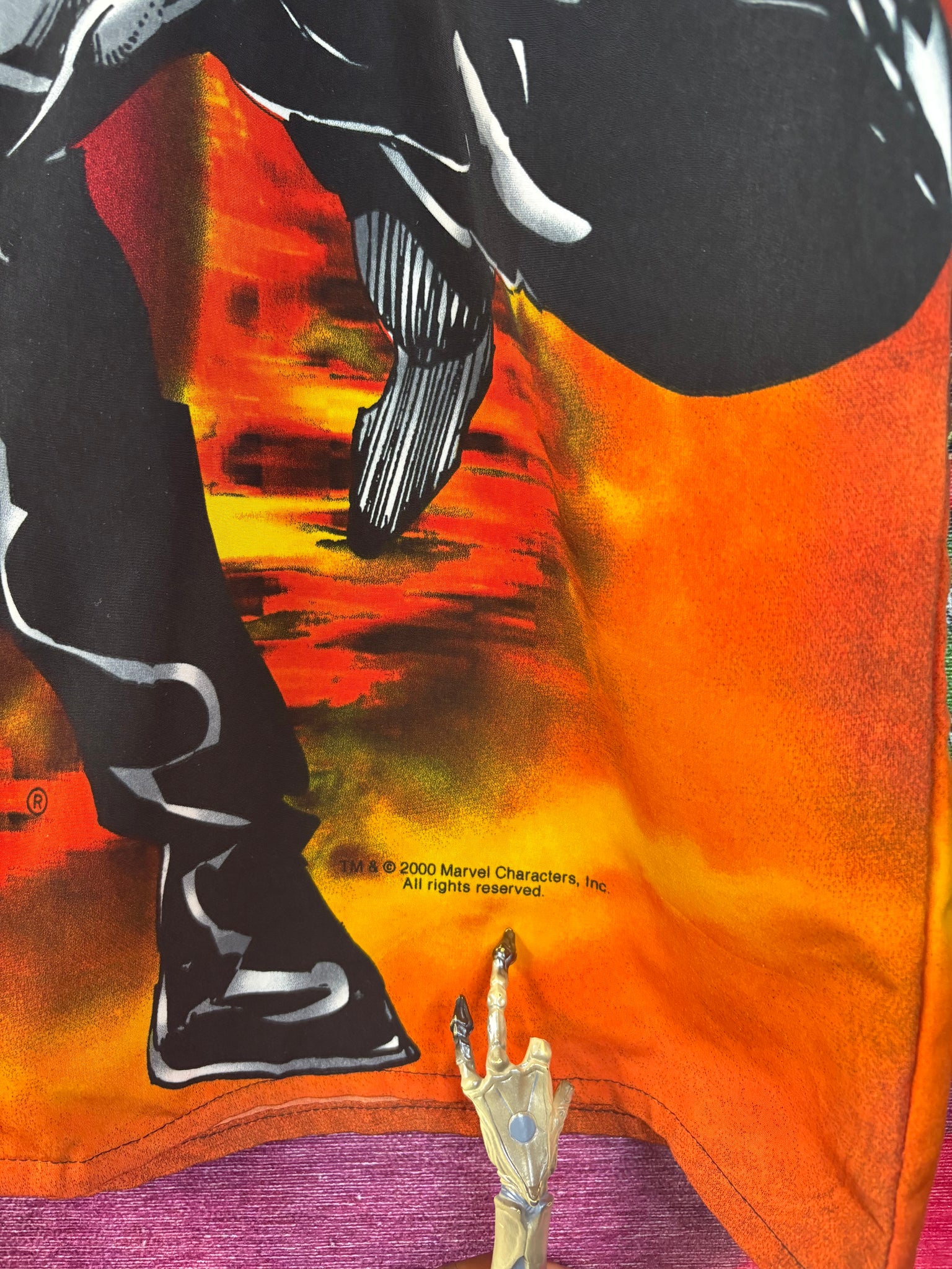 Make a bold statement with this incredible vintage 2000 Marvel Wolverine button-up shirt by Changes, featuring a powerful all-over graphic of the iconic X-Men character leaping from a fiery, orange backdrop. This is an essential piece of rare comic book apparel, perfect for collectors and fans who want to show off their mutant pride.