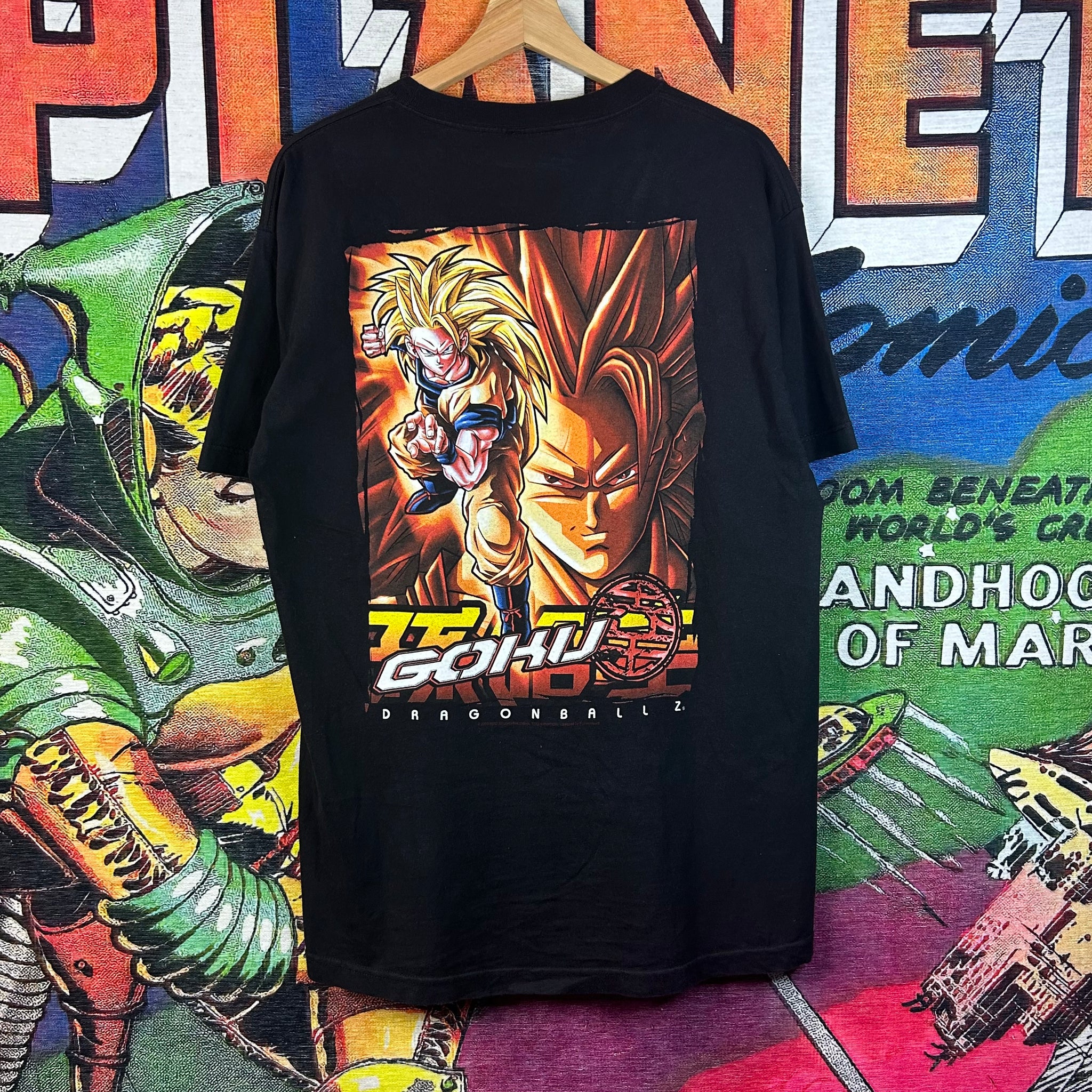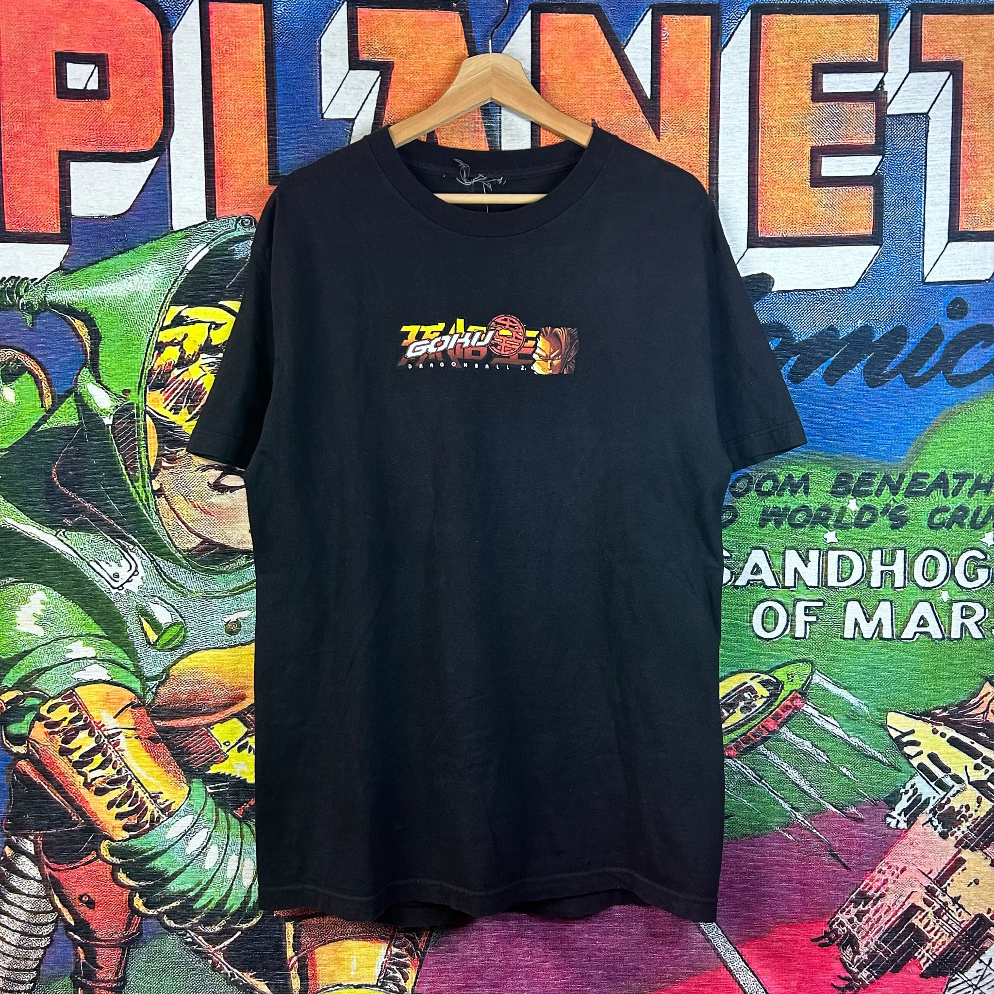 Vintage Y2K 2003 Dragon Ball Z Tee in Size Large. Features bold front graphic of iconic DBZ characters with classic early-2000s style print. A must-have for anime fans and collectors of vintage DBZ merchandise.