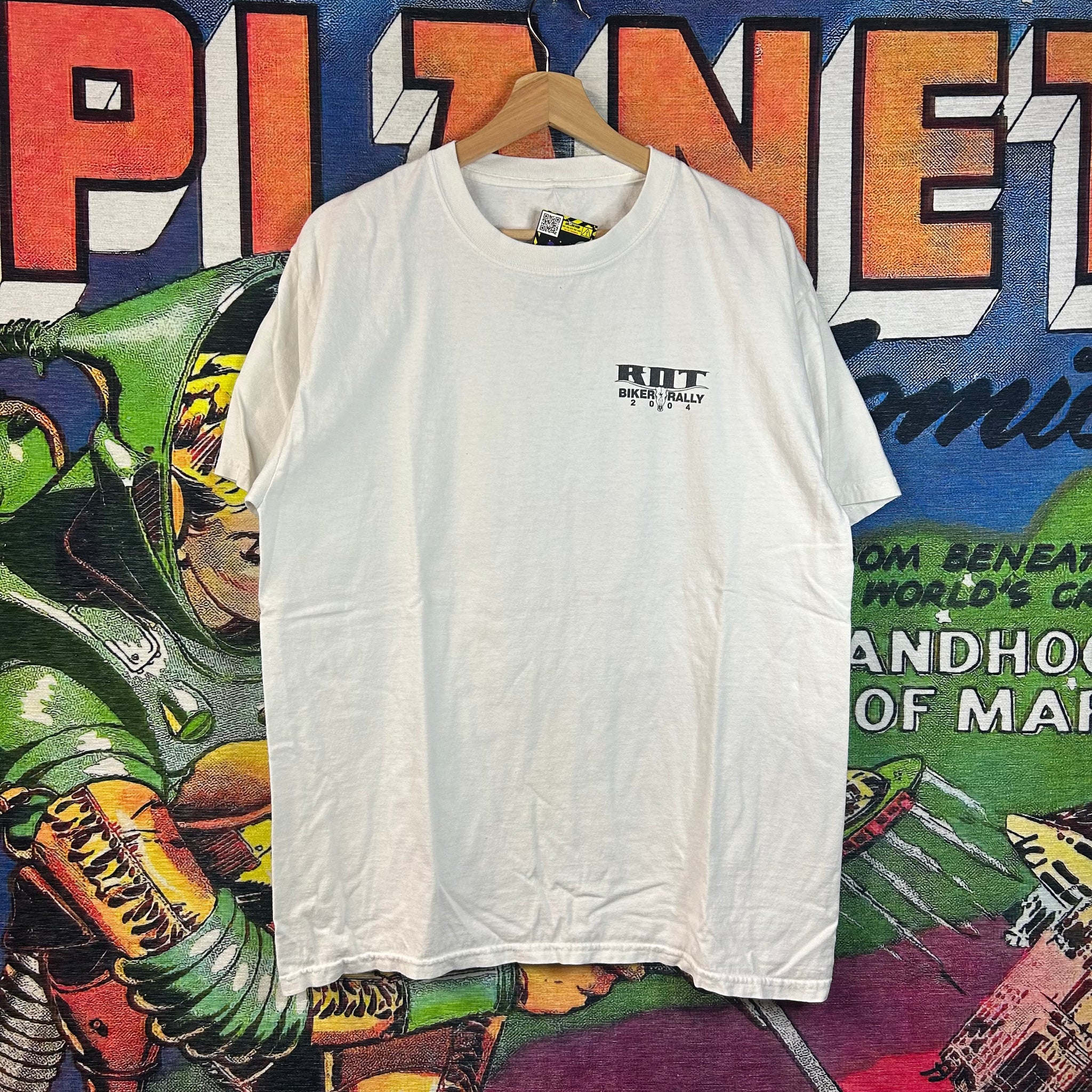 Bold early 2000s biker rally tee featuring a striking graphic design with classic Y2K edge. Perfect for fans of moto-inspired streetwear or collectors of vintage rally tees. Softly faded for that authentic worn-in look.