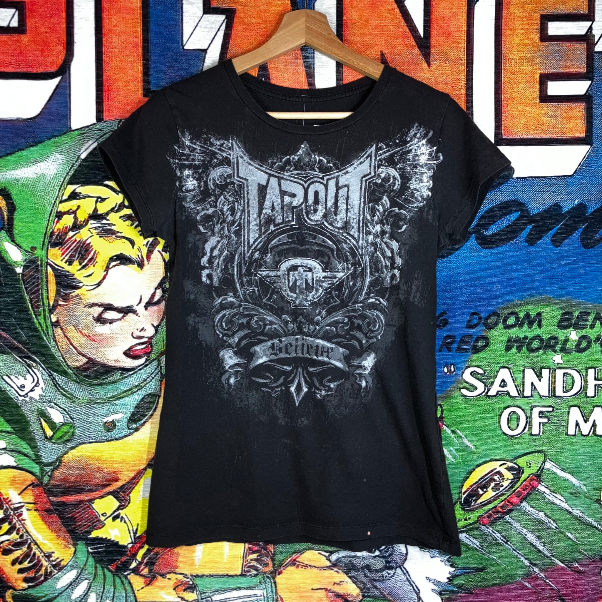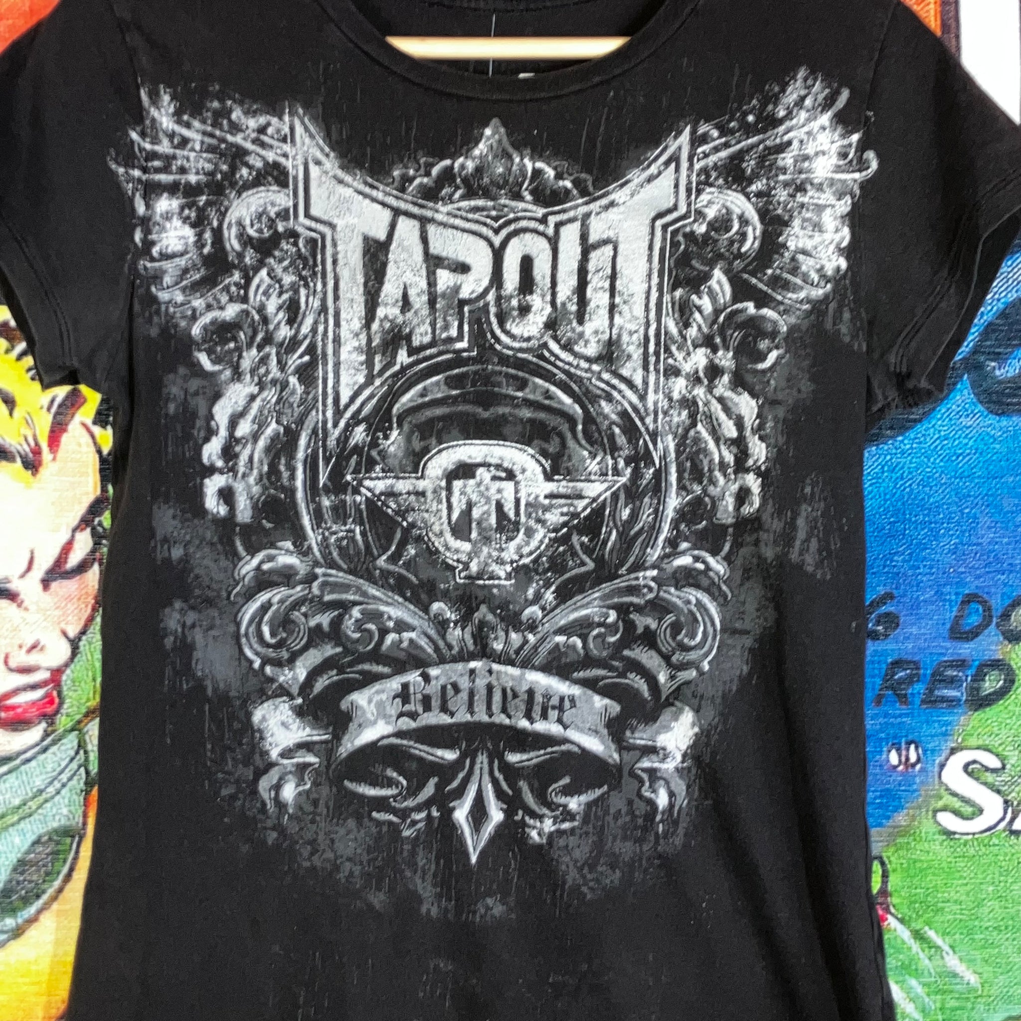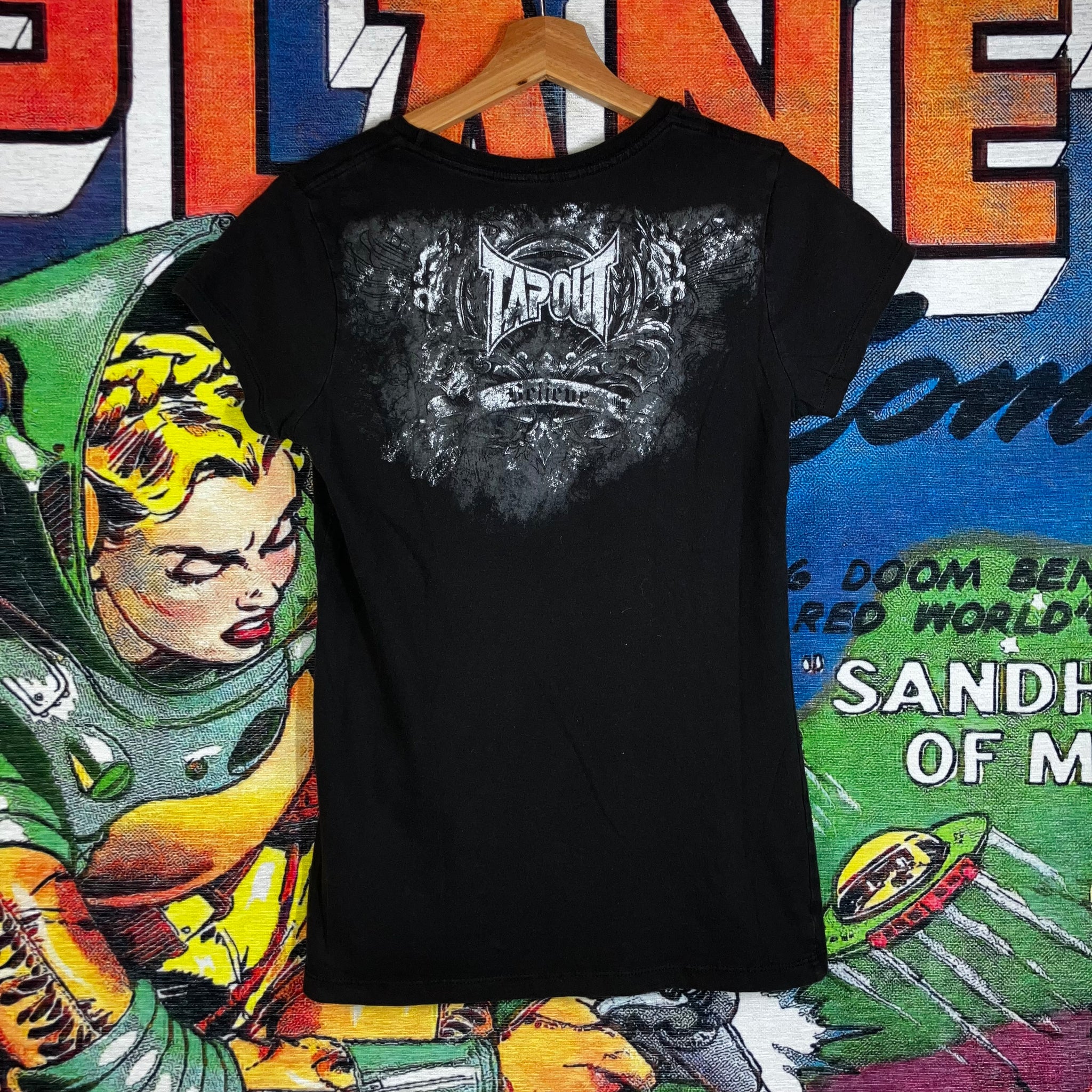 Unleash your fierce and fearless style with the Y2K Tapout Women's Graphic Tee! With its grunge mall goth aesthetic and elite MMA-inspired design, this size S/M shirt is perfect for any fan of the Tapout brand. Show off your love for all things edgy and powerful with this must-have addition to your wardrobe.