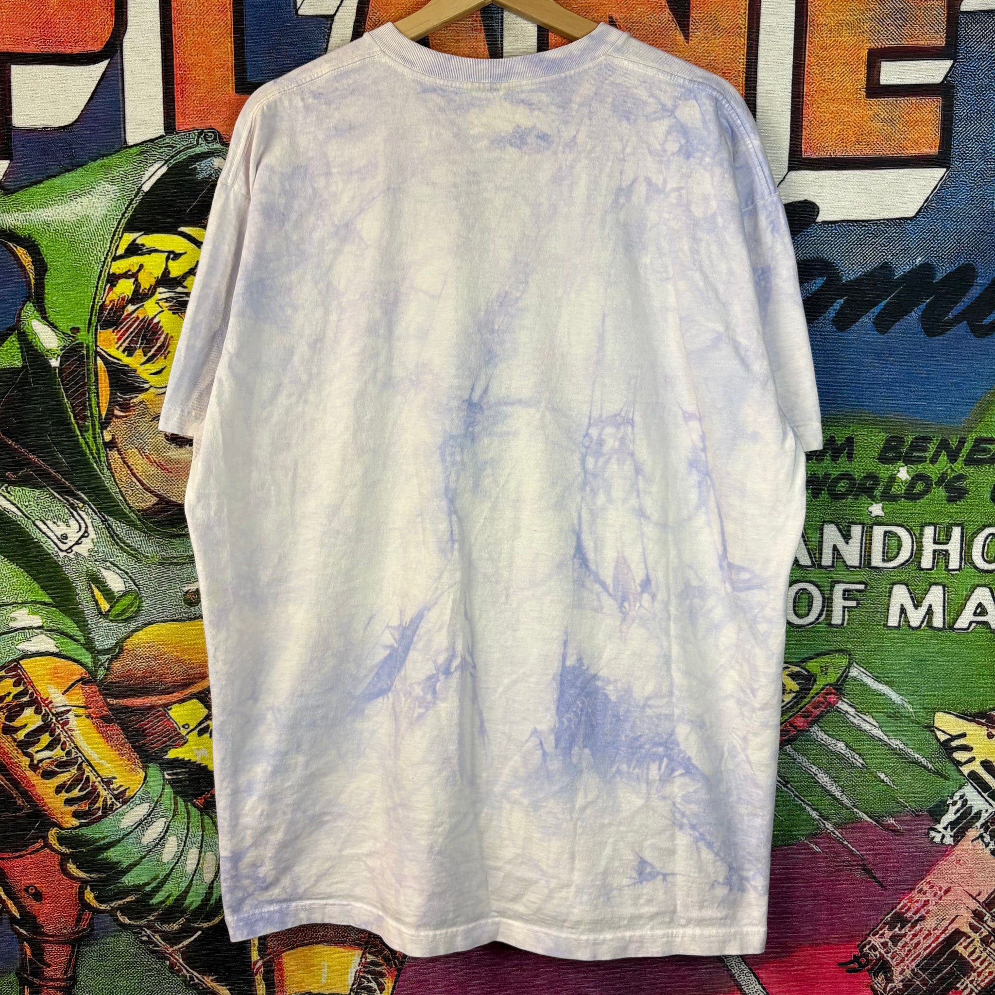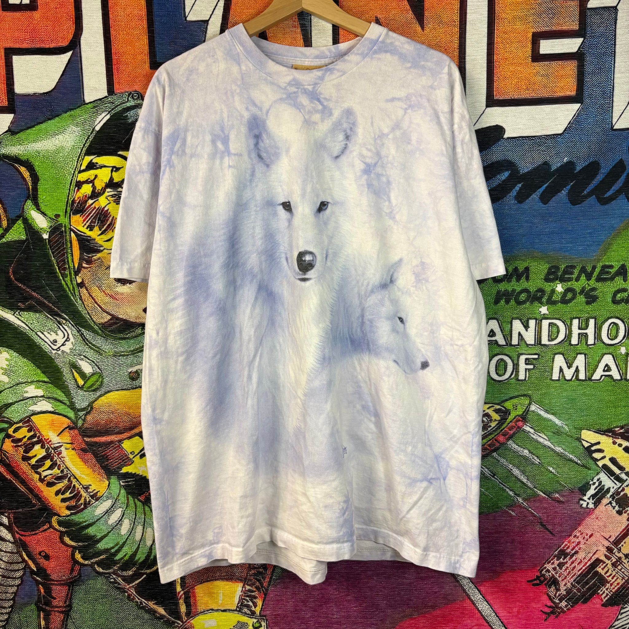 This is an iconic The Mountain t-shirt featuring a breathtaking wildlife graphic of two white wolves set against a striking pale blue and white tie-dye or 'cloud wash' background. The detail in the photorealistic wolf print is incredibly vivid, giving the shirt a powerful, majestic, and instantly recognizable nature-inspired aesthetic popular in vintage and Y2K clothing.